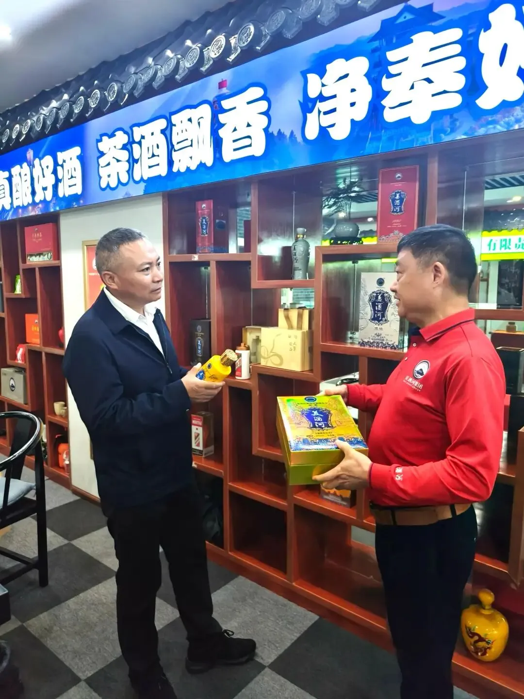 仁怀市副书记、市长陈清松在品牌展区调研指导,美酒河集团董事长蔡波汇报近年来的发展情况。