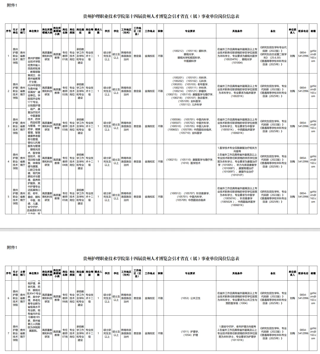 根据工作需要,贵州护理职业技术学院共设置7个岗位,拟引进急需紧缺人才7名。具体引才岗位及要求见《贵州护理职业技术学院第十四届贵州人才博览会引才省直(属)事业单位岗位信息表》(附件1)。