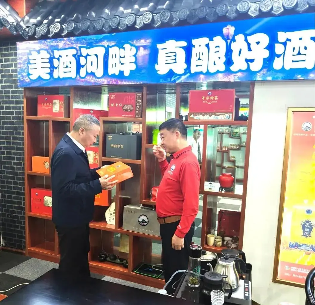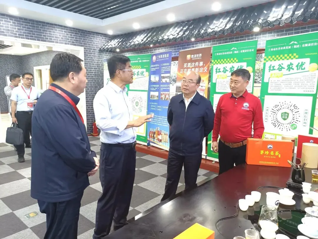 仁怀市副书记、市长陈清松在品牌展区调研指导,美酒河集团董事长蔡波汇报近年来的发展情况。