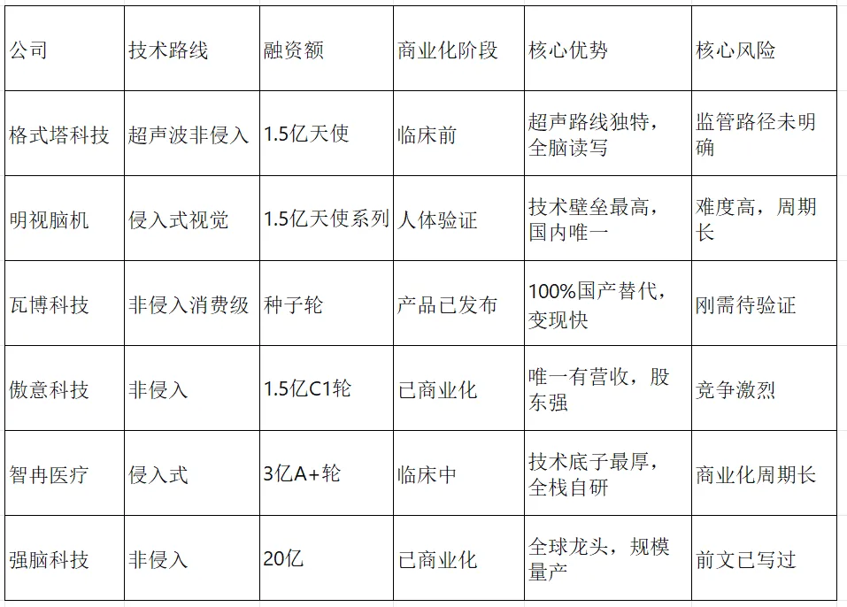 一句话定位: “杭州六小龙”之一,非侵入式脑机接口全球龙头。融资情况: 2026年1月完成约20亿元融资,为脑机接口领域全球第二大规模融资(仅次于Neuralink)。投资人包括IDG、华登国际、蓝思科技、韦尔股份等顶级机构与产业方。核心优势: 已获美国FDA认证、欧洲CE认证,是全球极其少数实现脑机接口产品规模量产的企业,产品曾获《时代》周刊年度最佳发明。? 6家公司核心对比
