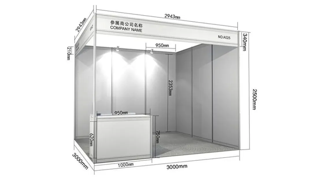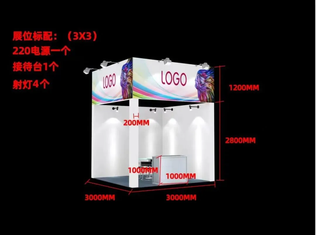 5000元/9㎡,包含门楣、围板、地毯、一桌二椅、2只射灯、电源插座一个。