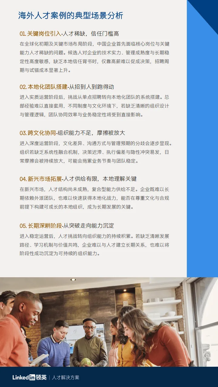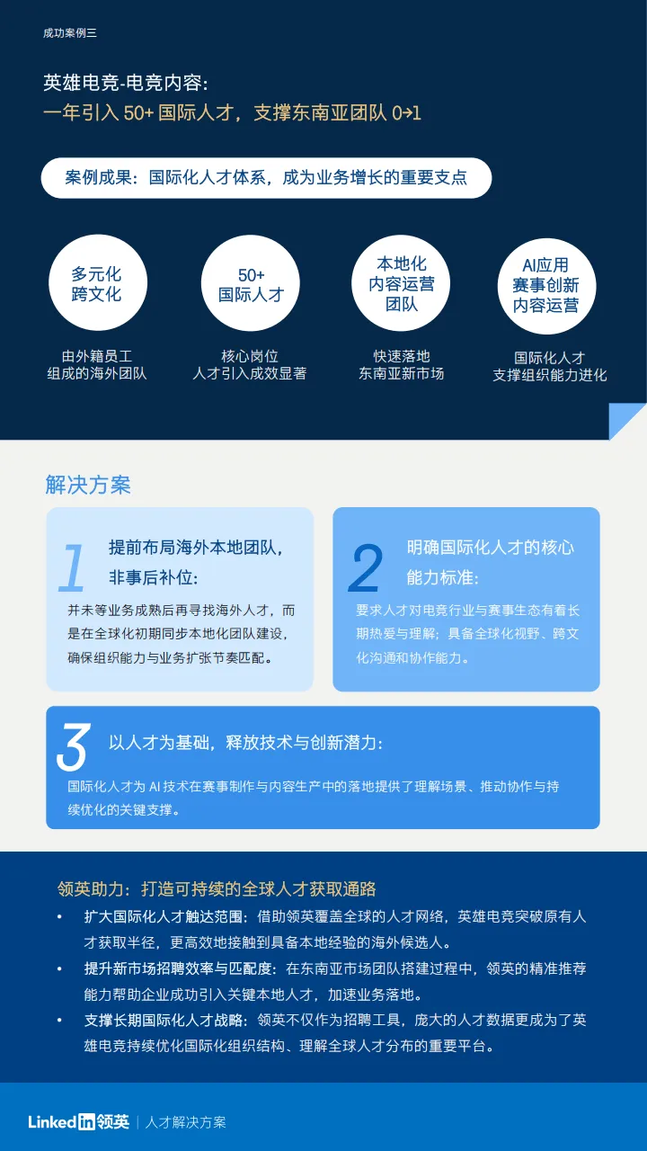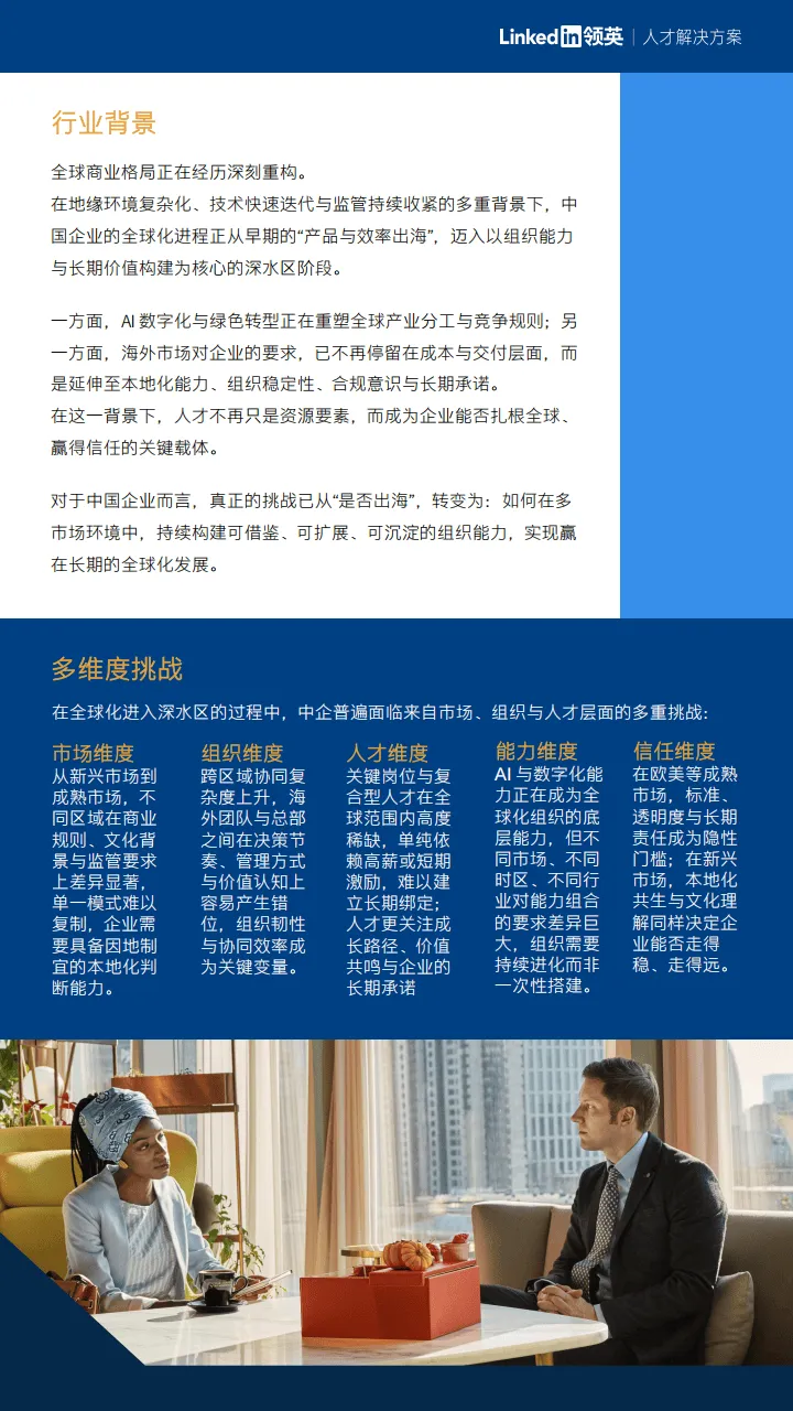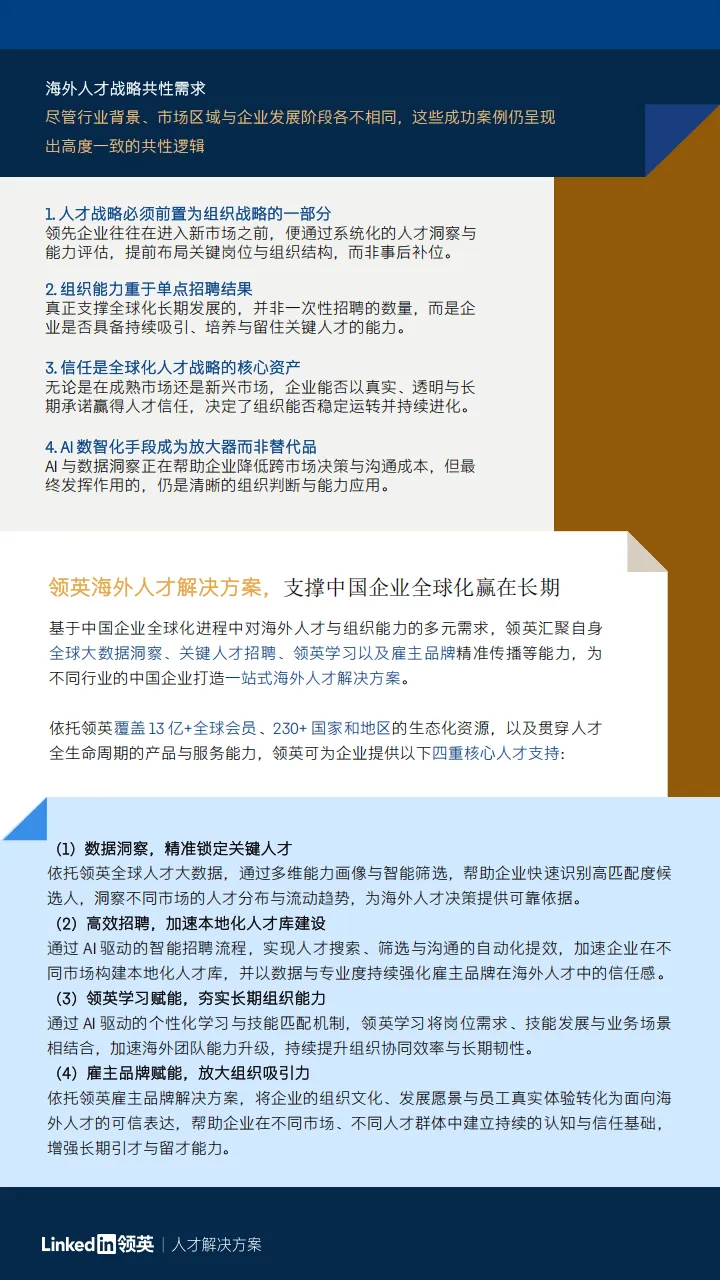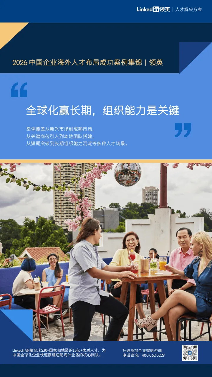 当前中国企业全球化已从产品出海迈入组织能力与长期价值构建的深水区,在地缘环境、技术迭代与监管变化的多重影响下,企业面临市场适配、跨区域协同、人才稀缺、能力升级、信任构建等多重挑战,海外人才布局成为全球化成败的核心关键。领英基于覆盖230多个国家和地区的13亿+全球人才资源,推出一站式海外人才解决方案,助力企业突破人才瓶颈,实现长期全球化发展。
