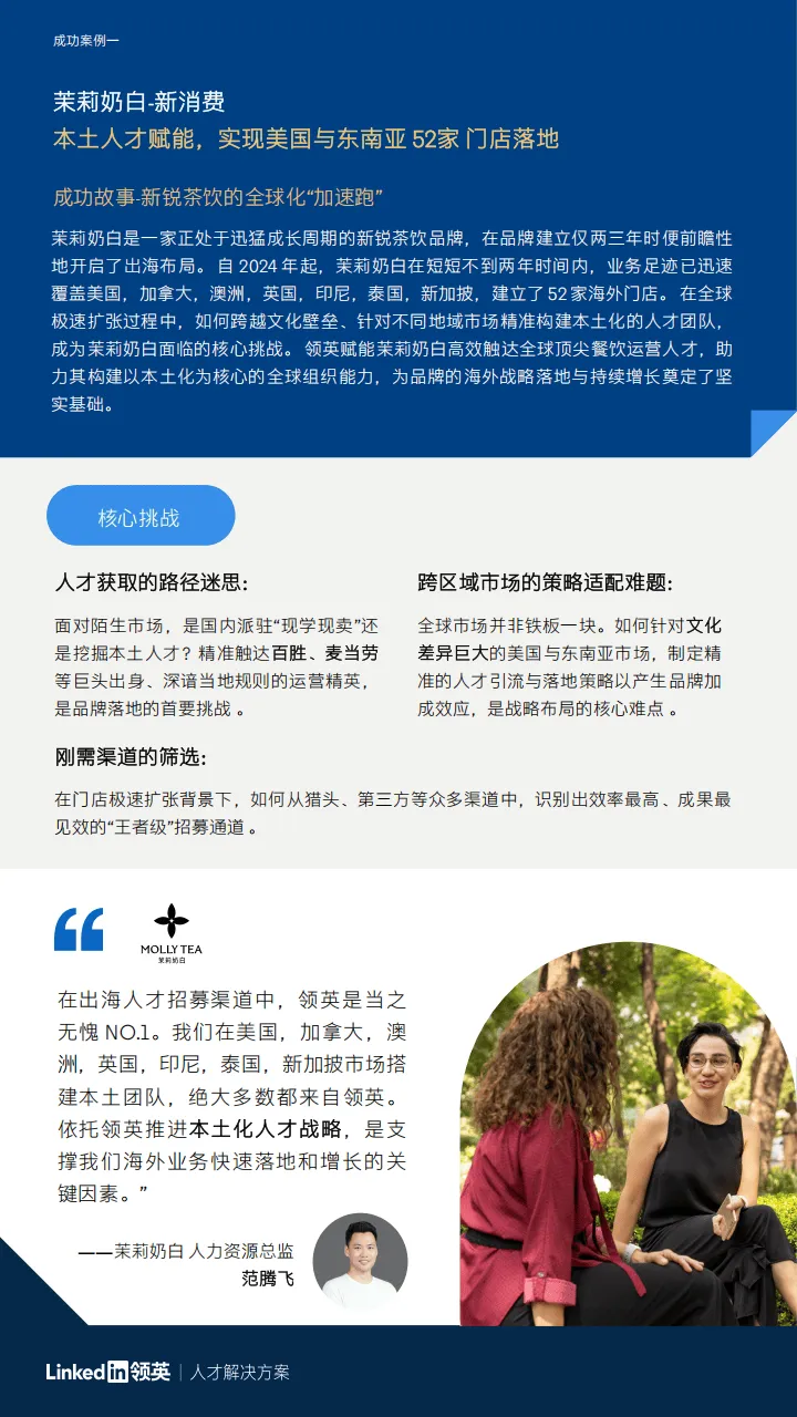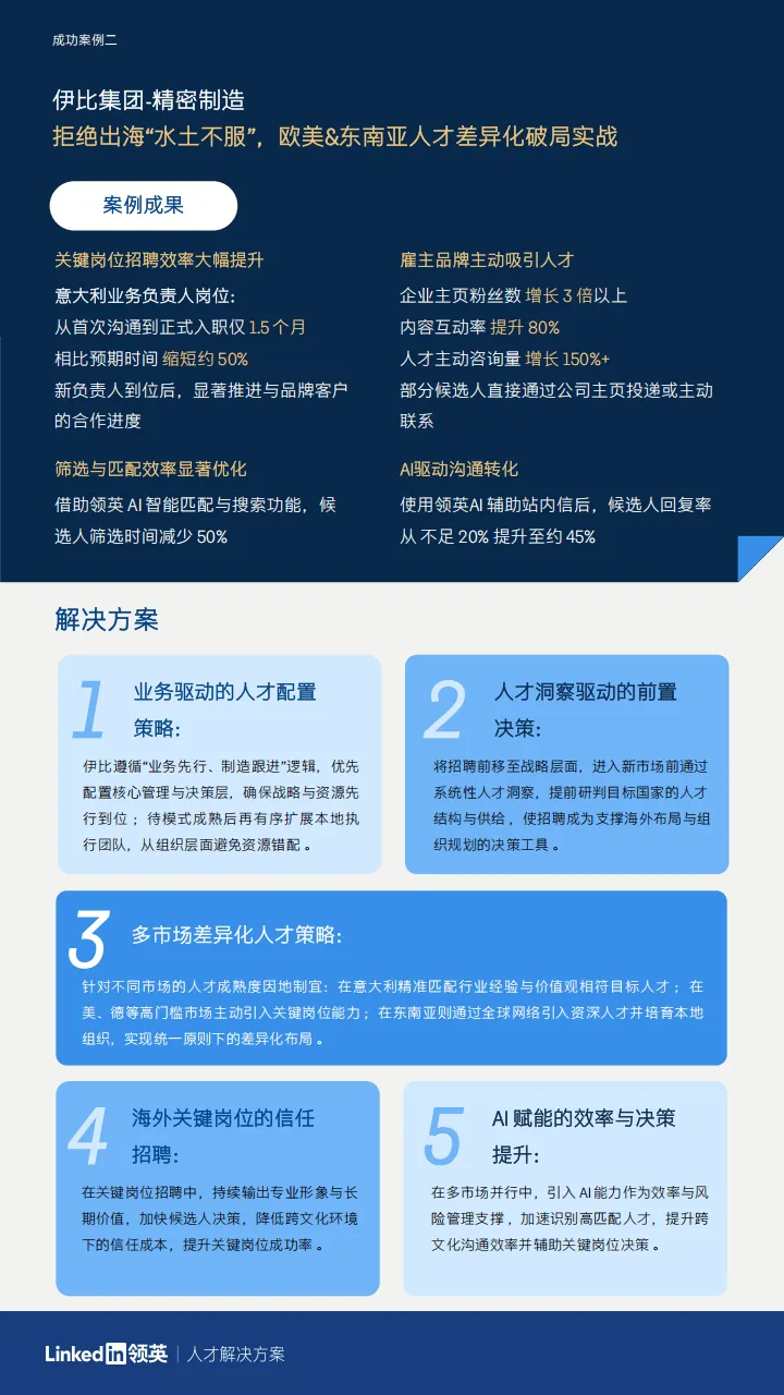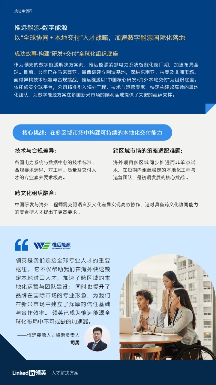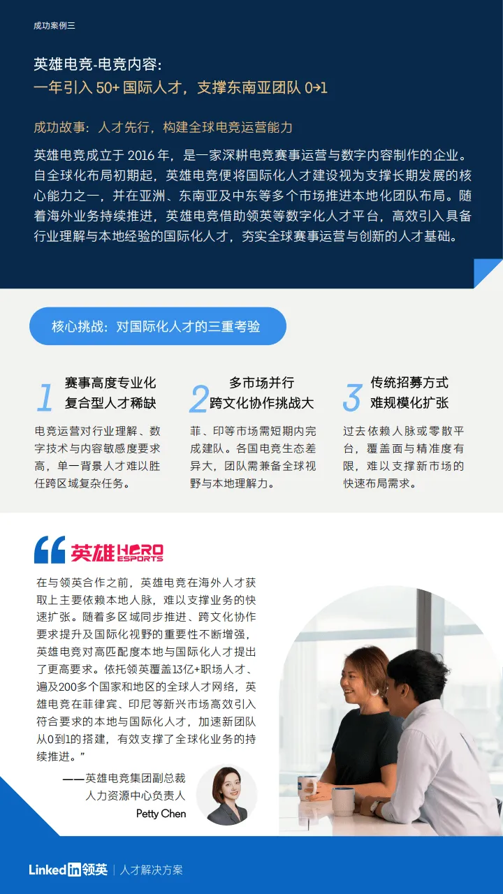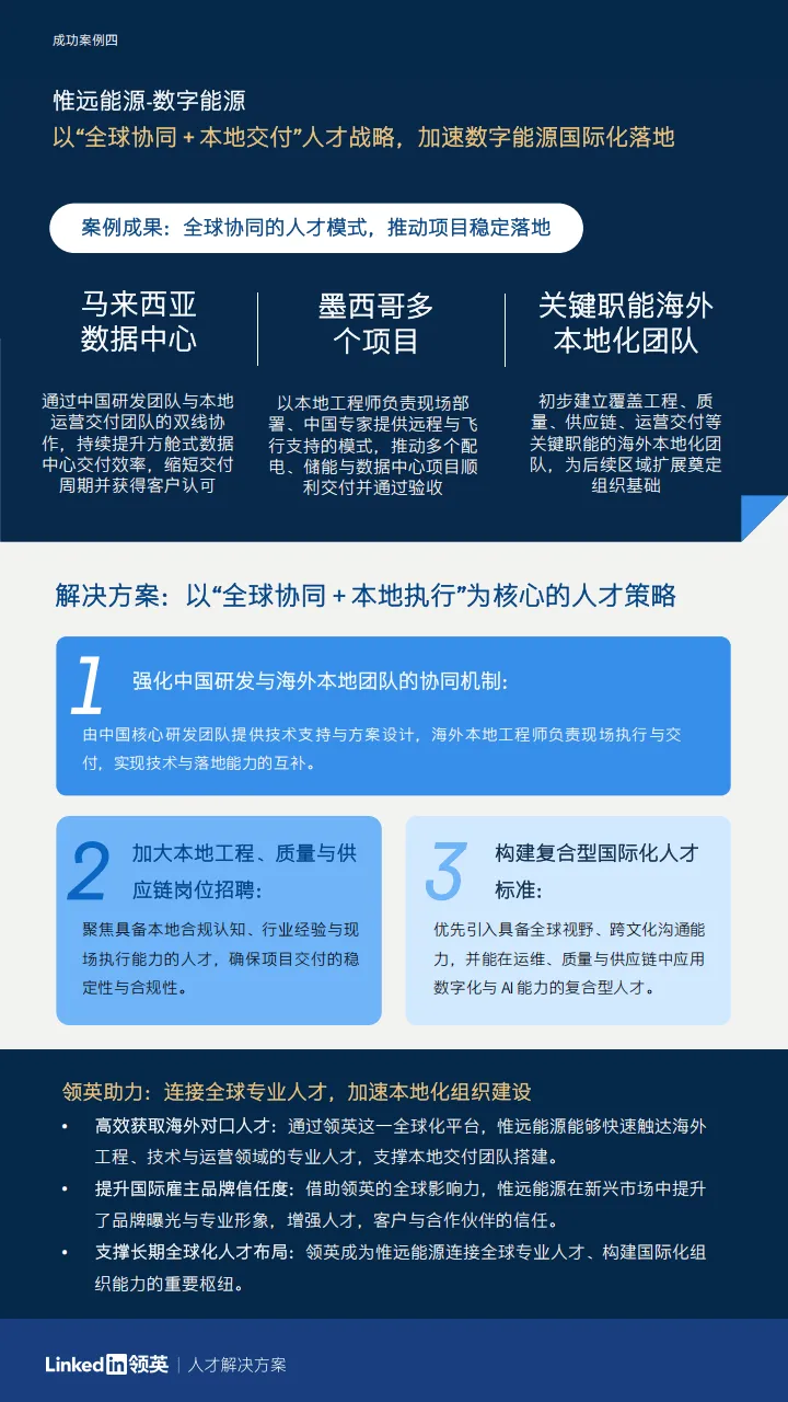 当前中国企业全球化已从产品出海迈入组织能力与长期价值构建的深水区,在地缘环境、技术迭代与监管变化的多重影响下,企业面临市场适配、跨区域协同、人才稀缺、能力升级、信任构建等多重挑战,海外人才布局成为全球化成败的核心关键。领英基于覆盖230多个国家和地区的13亿+全球人才资源,推出一站式海外人才解决方案,助力企业突破人才瓶颈,实现长期全球化发展。