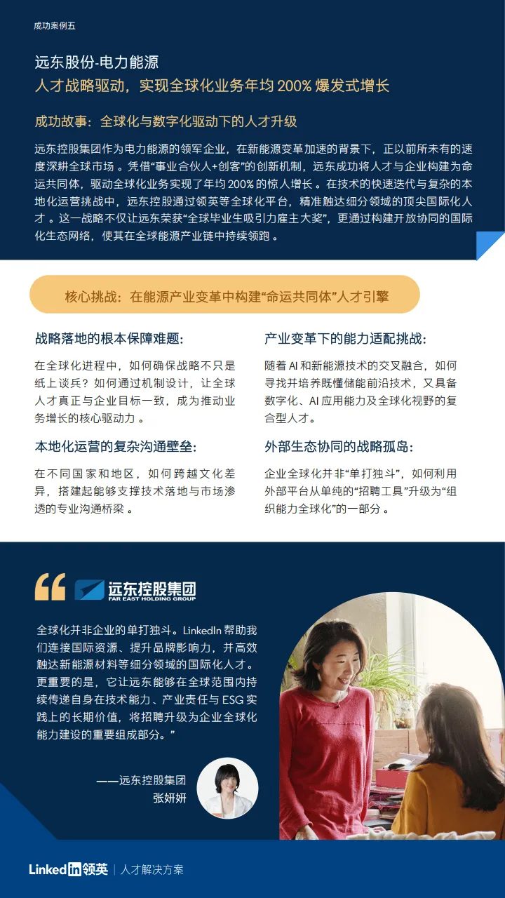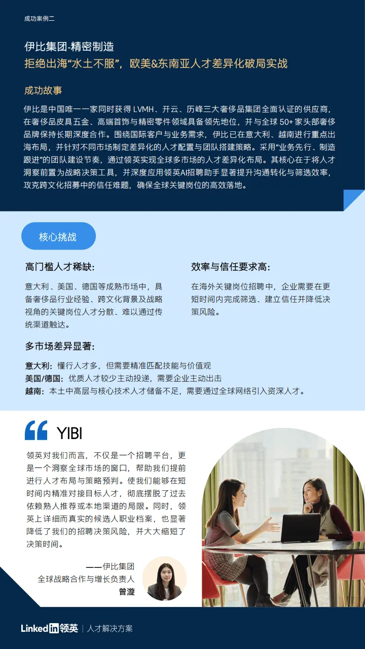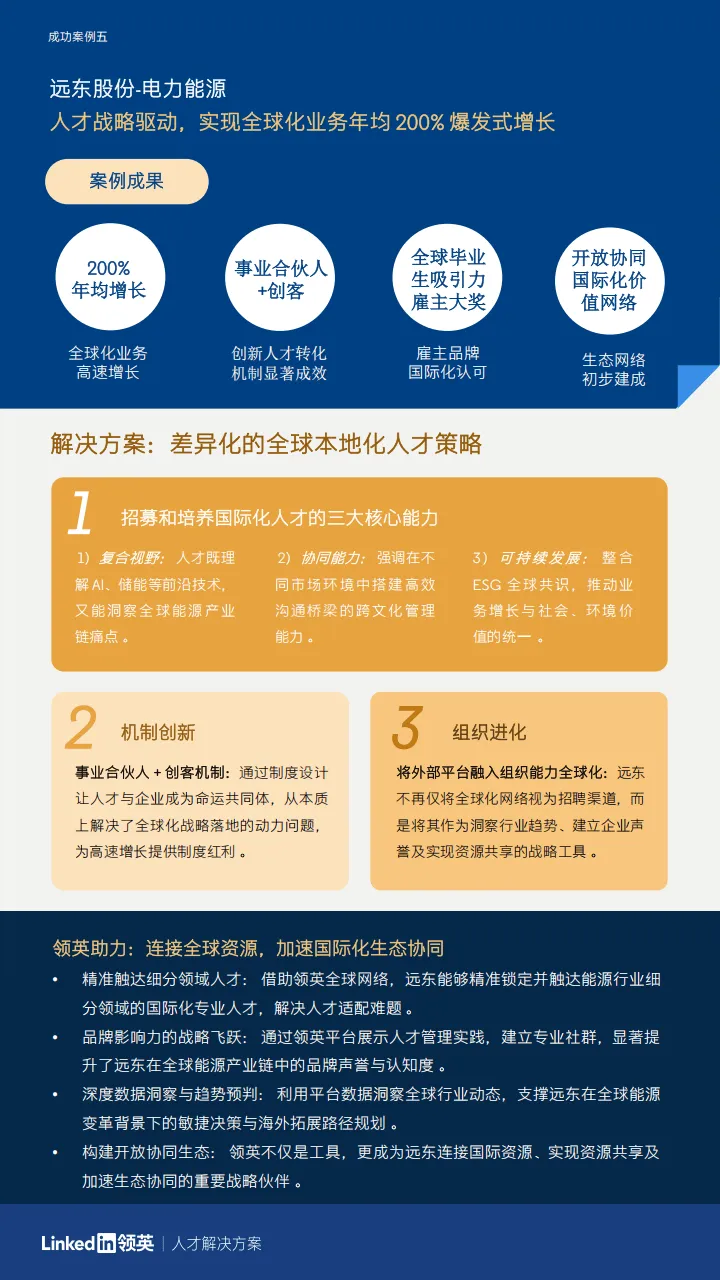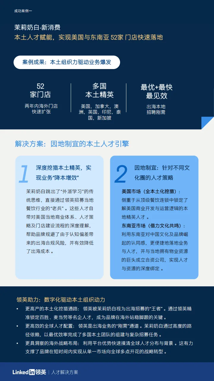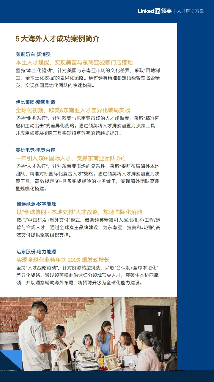 当前中国企业全球化已从产品出海迈入组织能力与长期价值构建的深水区,在地缘环境、技术迭代与监管变化的多重影响下,企业面临市场适配、跨区域协同、人才稀缺、能力升级、信任构建等多重挑战,海外人才布局成为全球化成败的核心关键。领英基于覆盖230多个国家和地区的13亿+全球人才资源,推出一站式海外人才解决方案,助力企业突破人才瓶颈,实现长期全球化发展。