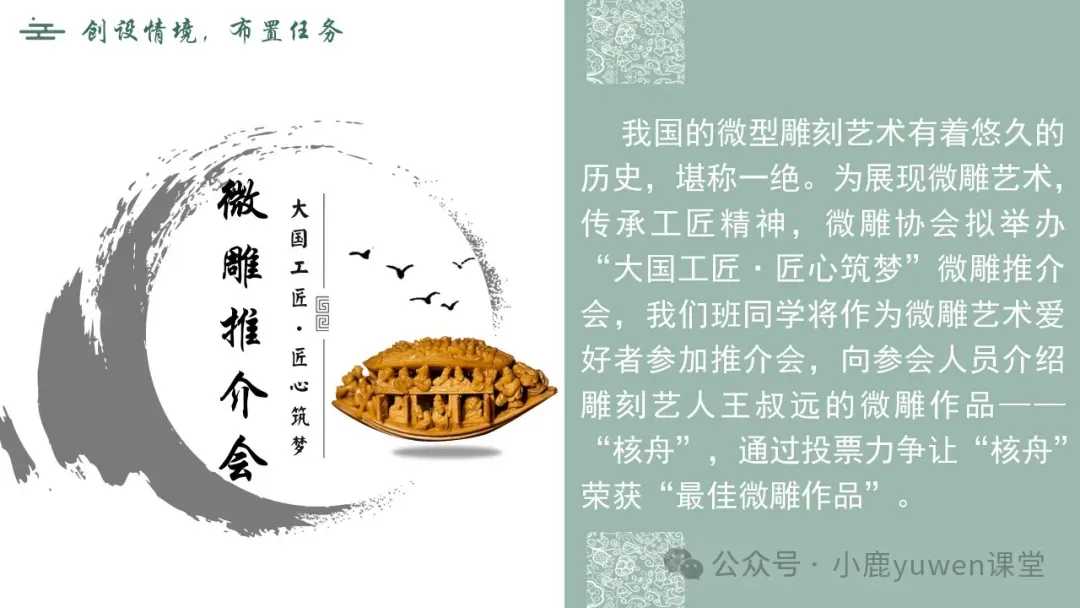 我国的微型雕刻艺术有着悠久的历史,堪称一绝。为展现微雕艺术,传承工匠精神,微雕协会拟举办“大国工匠·匠心筑梦”微雕推介会,我们班同学将作为微雕艺术爱好者参加推介会,向参会人员介绍雕刻艺人王叔远的微雕作品——“核舟”,通过投票力争让“核舟”荣获“最佳微雕作品”。