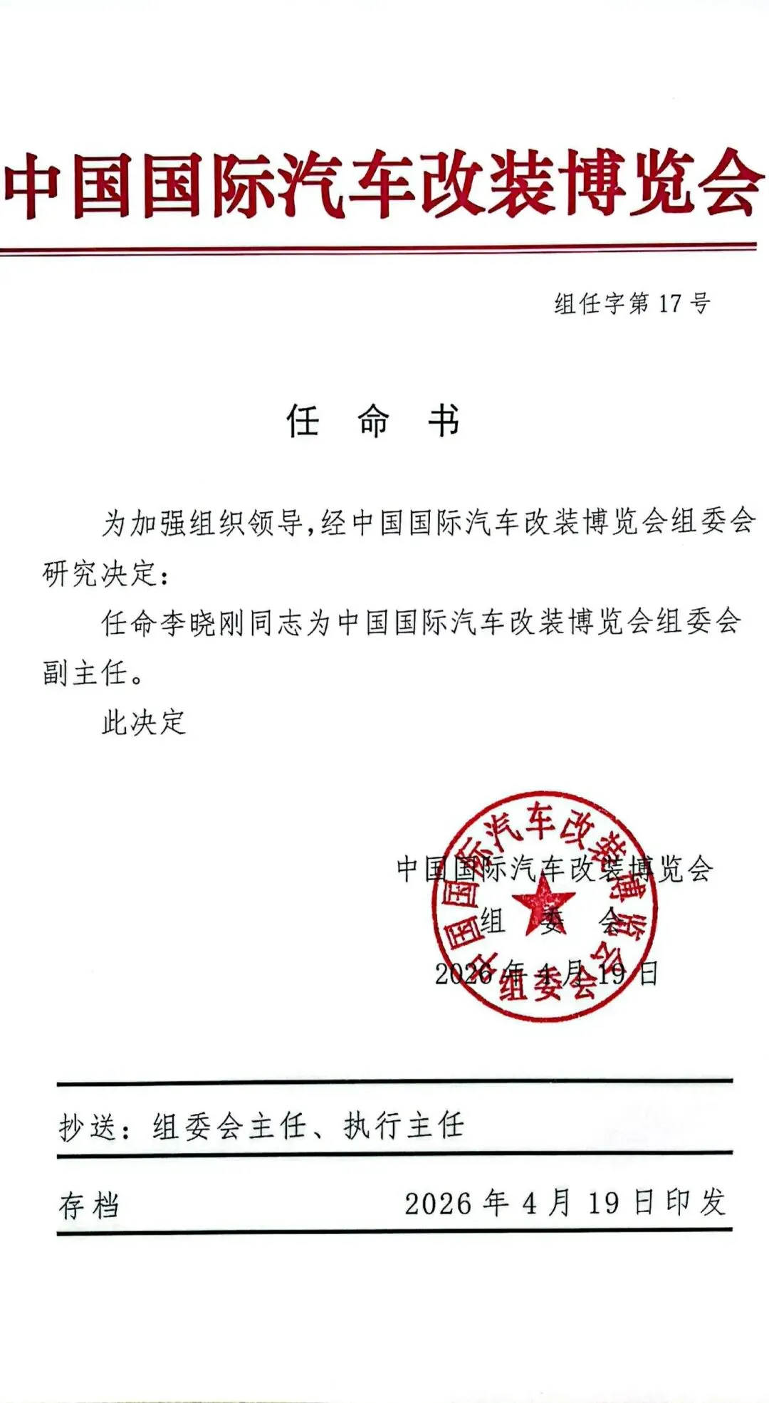 肩负重托,砥砺前行。2026年4月19日,经中国国际汽车改装博览会组委会研究决定,正式任命李晓刚同志为中国国际汽车改装博览会组委会副主任。