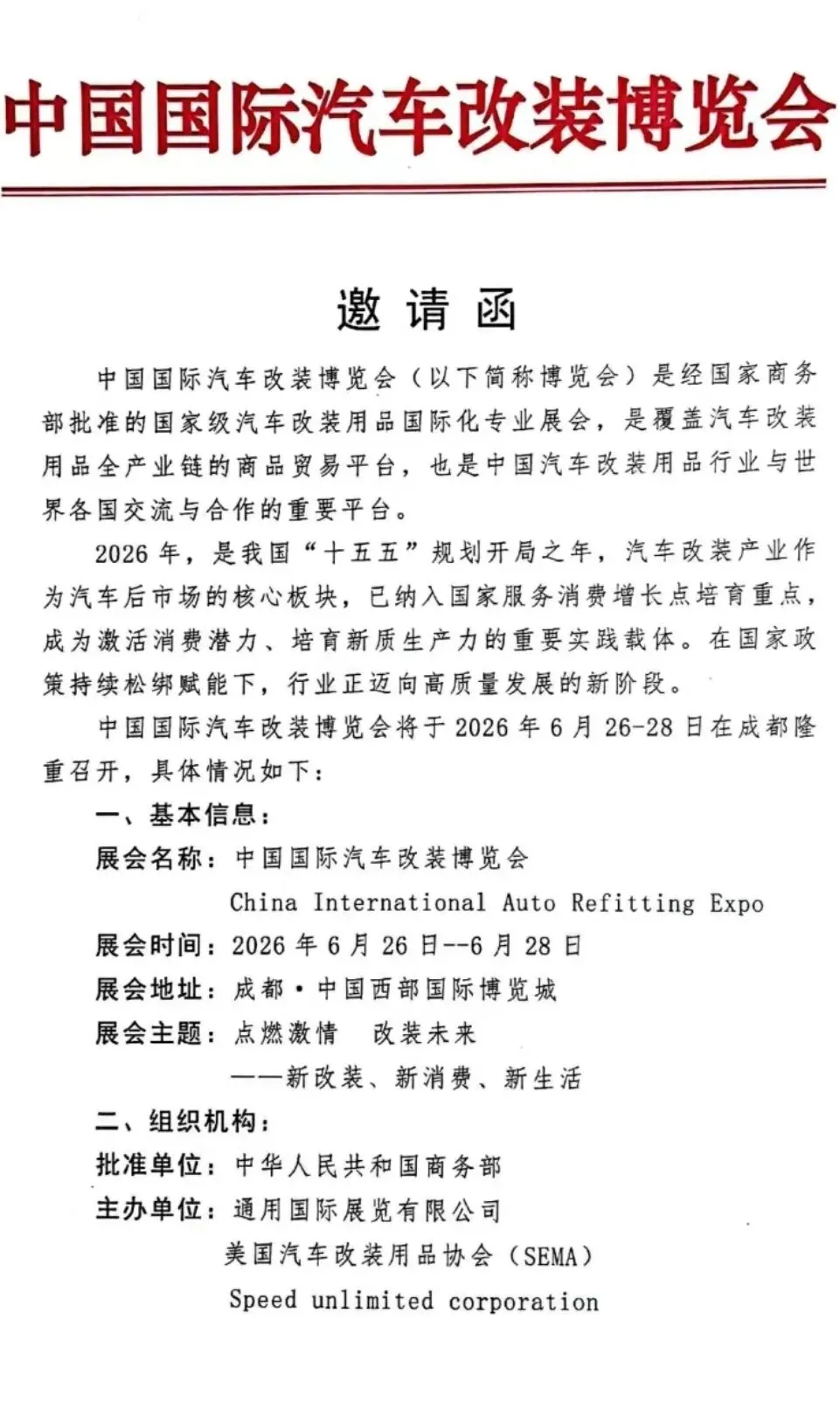 道阻且长,行则将至;行而不辍,未来可期 组委会及商会团队将不忘初心、不辱使命、全力以赴,扎实做好各项筹备与服务工作。诚挚期待2026年中国国际汽车改装博览会,与全国各地行业同仁、广大爱车一族相聚成都,共赴改装行业盛宴,共同见证中国汽车改装产业的蓬勃力量!招商服务热线: