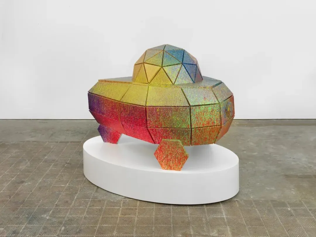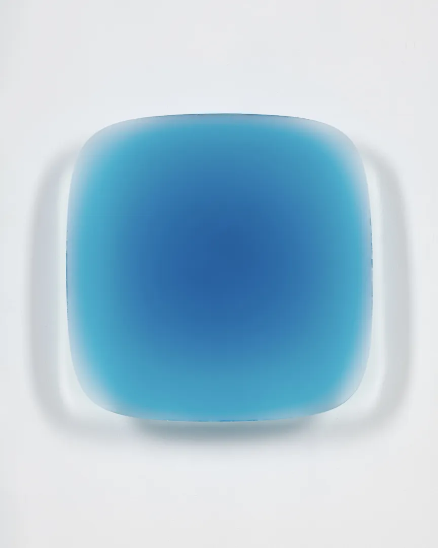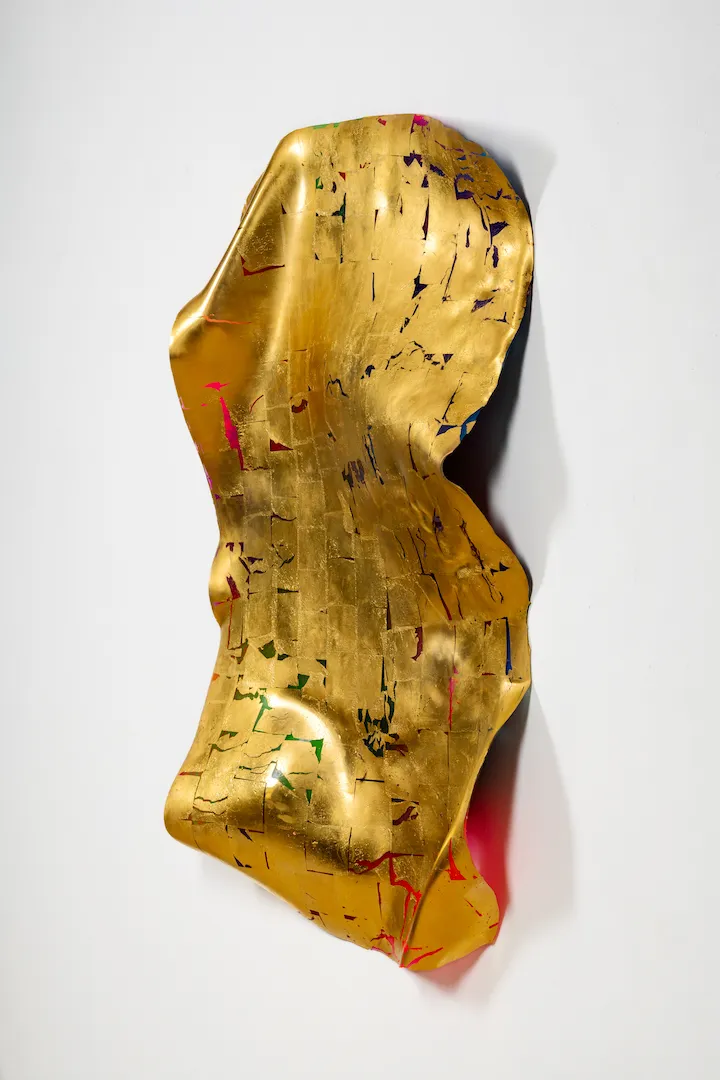 在「画布雕塑」系列《金色振荡》(Golden Oscillations)中,作品表面覆以金箔,其下的结构与色彩在不同光线和观看角度下若隐若现,促成多重视觉状态的持续交迭:既呈现出轻盈流动的色彩效果,也显现出相对凝练与内敛的视觉特征。由此,画布不再作为支撑结构而存在,其固有的限制被解除,并以更为开放的方式在空间中展开。