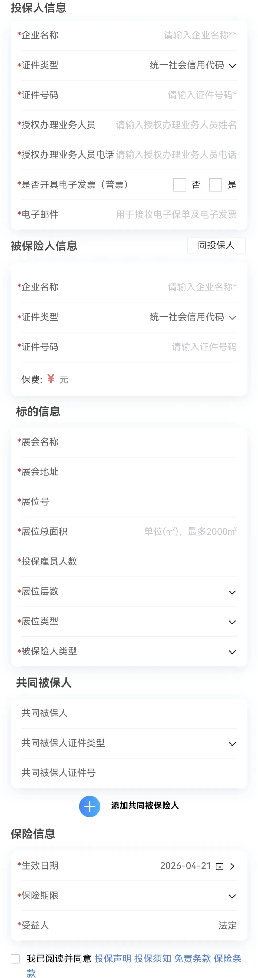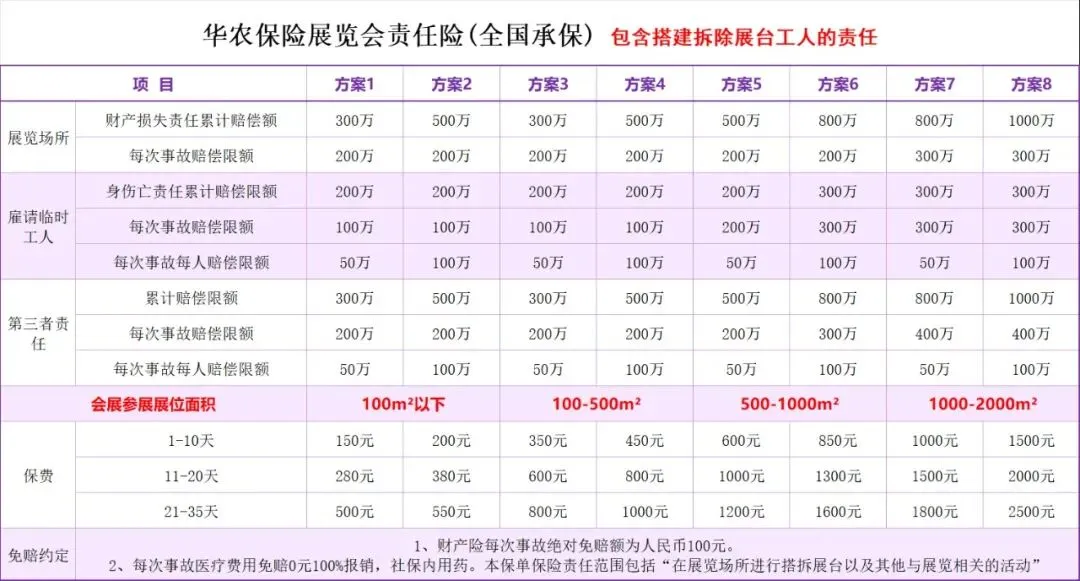 1、投保提示:本保单每个展位仅限投保1份,多投无效。保障期间请投保人按布展时间至撤展时间选择,保险起期最早为投保次日0时,投保人需在保险起期前完成缴费。请您如实填写投保单,如故意隐瞒事实,不履行如实告知义务的,本公司有权解除保险合同或不承担保险责任,对已支付的赔款,本公司有权要求退还。