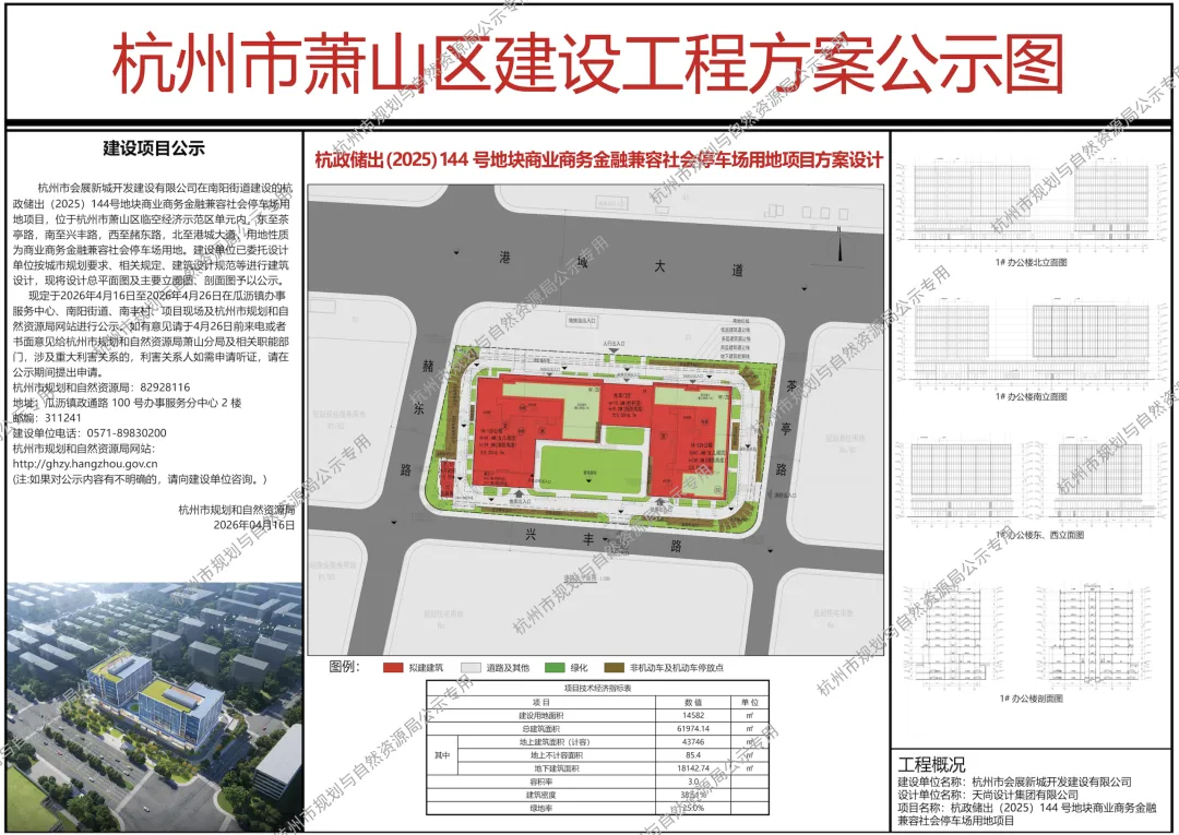 杭州市会展新城开发建设有限公司在南阳街道建设的杭政储出(2025)144号地块商业商务金融兼容社会停车场用地项目,位于杭州市萧山区临空经济示范区单元内,东至茶亭路,南至兴丰路,西至赭东路,北至港城大道,用地性质为商业商务金融兼容社会停车场用地。建设单位已委托设计单位按城市规划要求、相关规定、建筑设计规范等进行建筑设计,现将设计总平面图及主要立面图、剖面图予以公示。