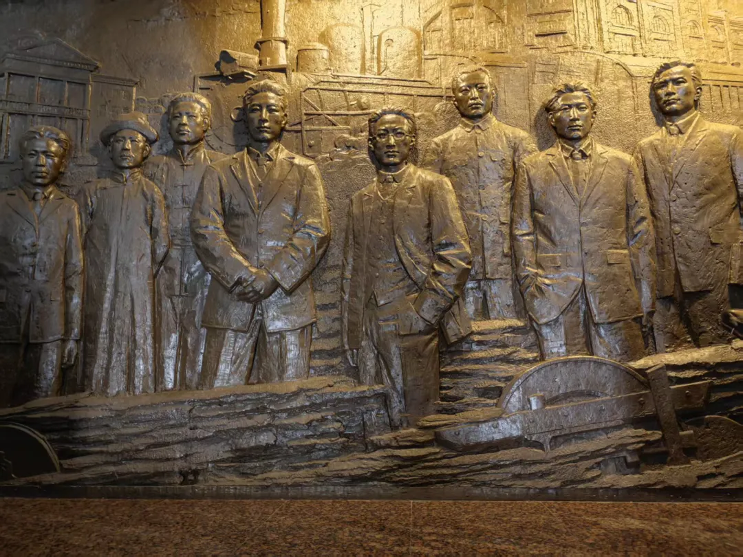 (展馆内浮雕墙展示了代表们秘密赴会的艰难历程。)