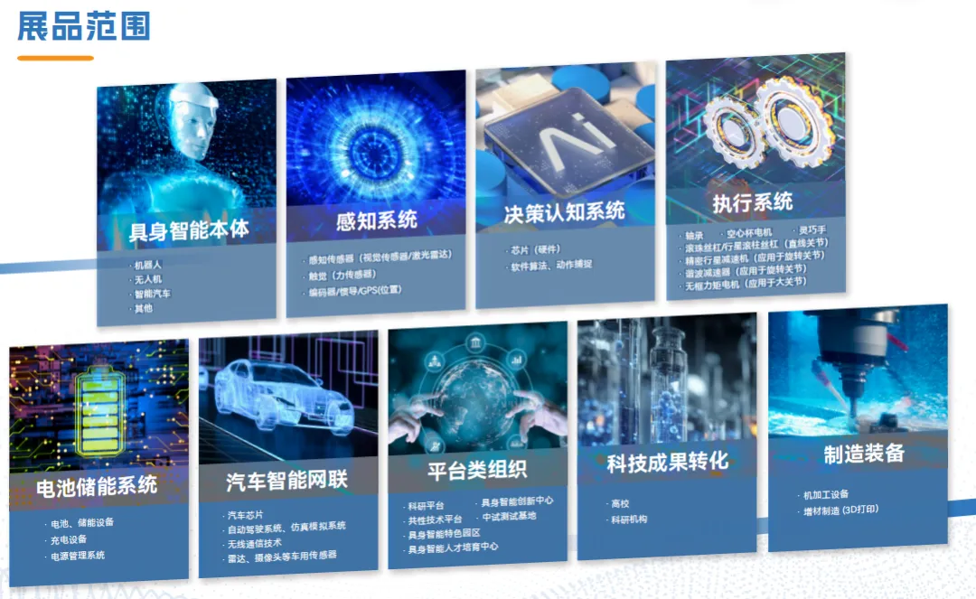 ![]() 具身智能本体:人形 / 工业 / 服务 / 医疗机器人、无人机、智能汽车等整机; 感知系统:视觉传感器、激光雷达、力传感器、编码器、惯导、GPS; 决策认知系统:AI 芯片(GPU/TPU/NPU)、算法模型、动作捕捉技术; 执行系统:谐波减速器、空心杯电机、灵巧手、精密行星减速机、无框力矩电机; 电池储能系统:动力电池、储能设备、快充 / 换电、电源管理 BMS; 汽车智能网联:车规芯片、自动驾驶方案、车路协同、车用雷达 / 摄像头; 平台类组织:科研平台、创新中心、中试基地、产业园区、人才培育中心; 科技成果转化:高校 / 科研院所技术成果、产学研合作项目; 制造装备:机加工设备、3D 打印(增材制造)、精密装配线 |