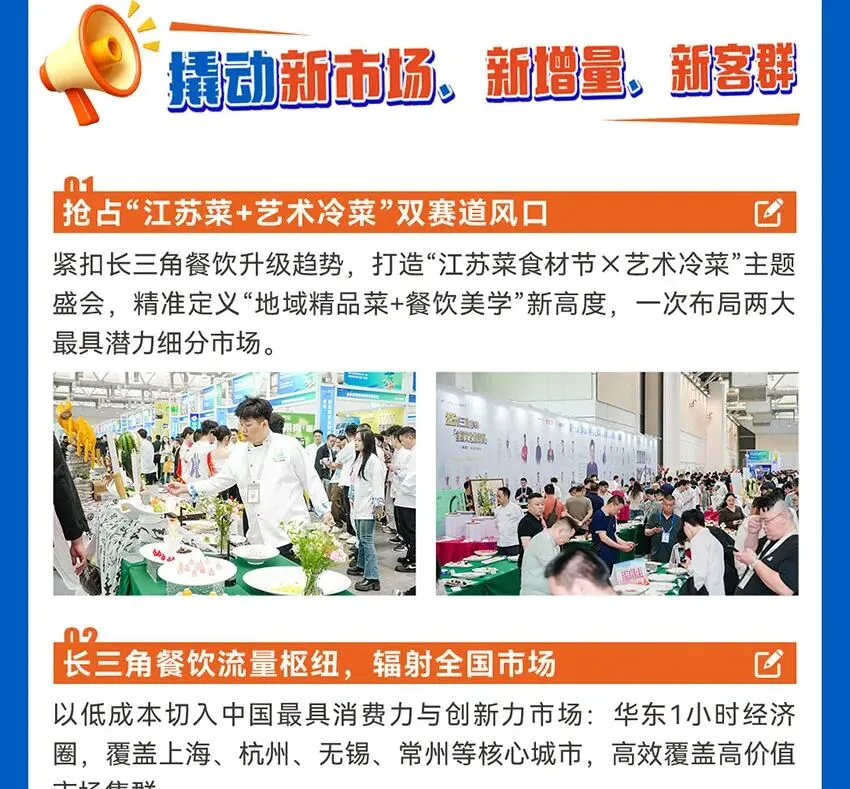 内容:邀请江苏十三地市及长三角其他地区厨师精英参与,围绕经典菜与春季创新菜展开比拼,同步呈现宴席创作、名厨演示、非遗技艺展示等内容,联动食材企业食材应用,打造集厨艺交流、菜品研发、产业对接于一体的长三角餐饮行业盛会。