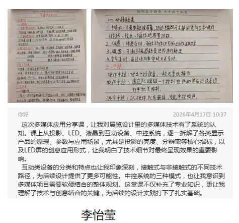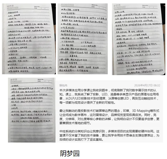 以技术赋能创意,以专业夯实根基。此次课程不仅是创新设计产业学院深耕专业教学、对接行业需求的生动实践,更为同学们搭建了理论与实践衔接的桥梁。愿同学们带着课堂所学,在阶段项目实践中锤炼专业能力,在科技与创意的碰撞中,探索展陈行业的无限可能,让每一份创意都能凭借扎实的技术,落地成有温度、有力量的优质作品。
