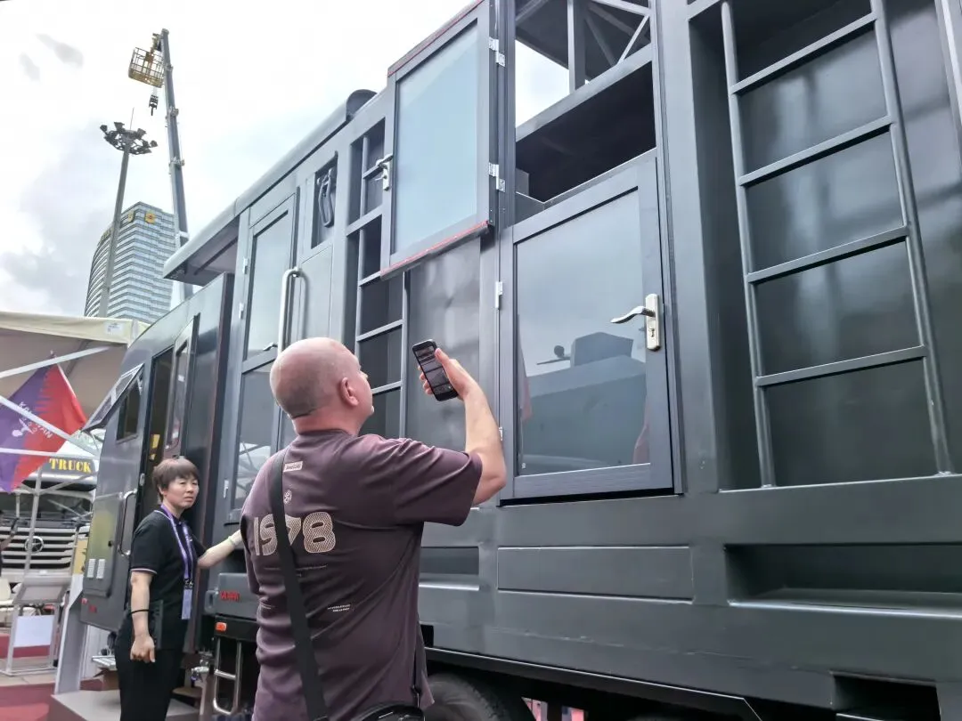 而另一款“硬核”装备同样引起众人好奇,不少采购商上前拍摄、深入了解。这款无人飞行器监控平台及特种设备拖车,可搭载无人机与远程操控室协同作业,最大飞行距离可达200公里,最高飞行高度4000米,适用于警用安保、海上巡逻、边境防控、山区及矿区监控等多种场景。