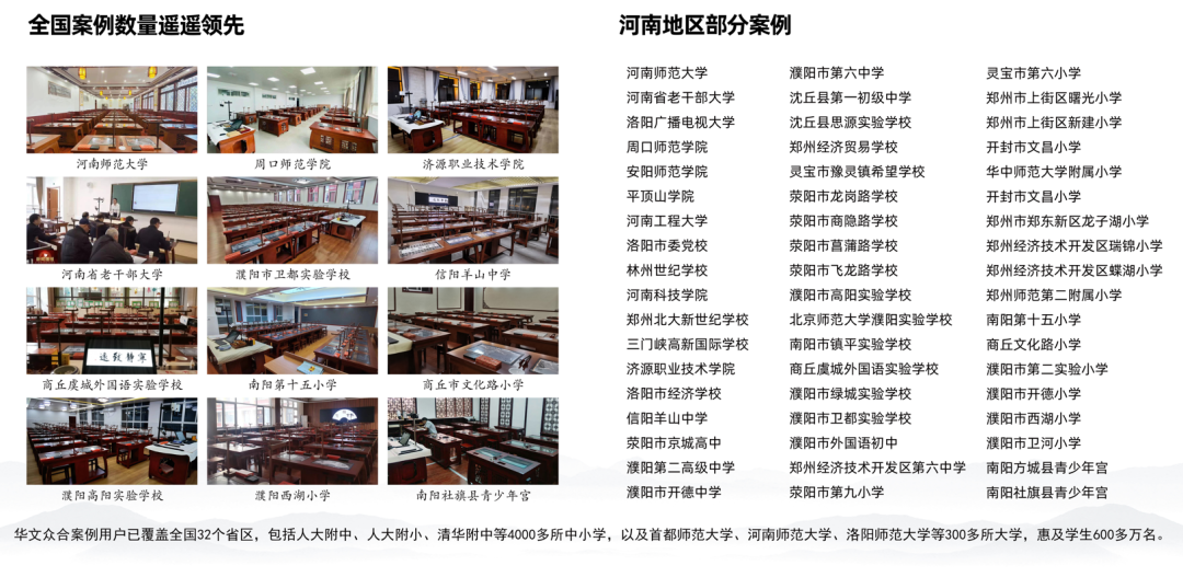 华文众合第8代智慧书法教室解决书法教学书法师资欠缺、书法课程体系欠缺等难题的同时,也是在助力传统文化教育,提升学生的传统文化素养、让传统文化不断层,让学生得到中华优秀传统文化的滋养,认识到汉字、传统文化的伟大,从小培养文化自信。目前,华文众合智慧书法教室已走进全国4000多所中小学以及300多所大学,包括清华大学附属中学、中国人民大学附属中学、中国人民大学附属小学、首都师范大学等名校。在河南地区也拥有众多用户案例,例如河南师范大学、河南省老干部大学、濮阳市外国语初中、郑州龙子湖小学等等。