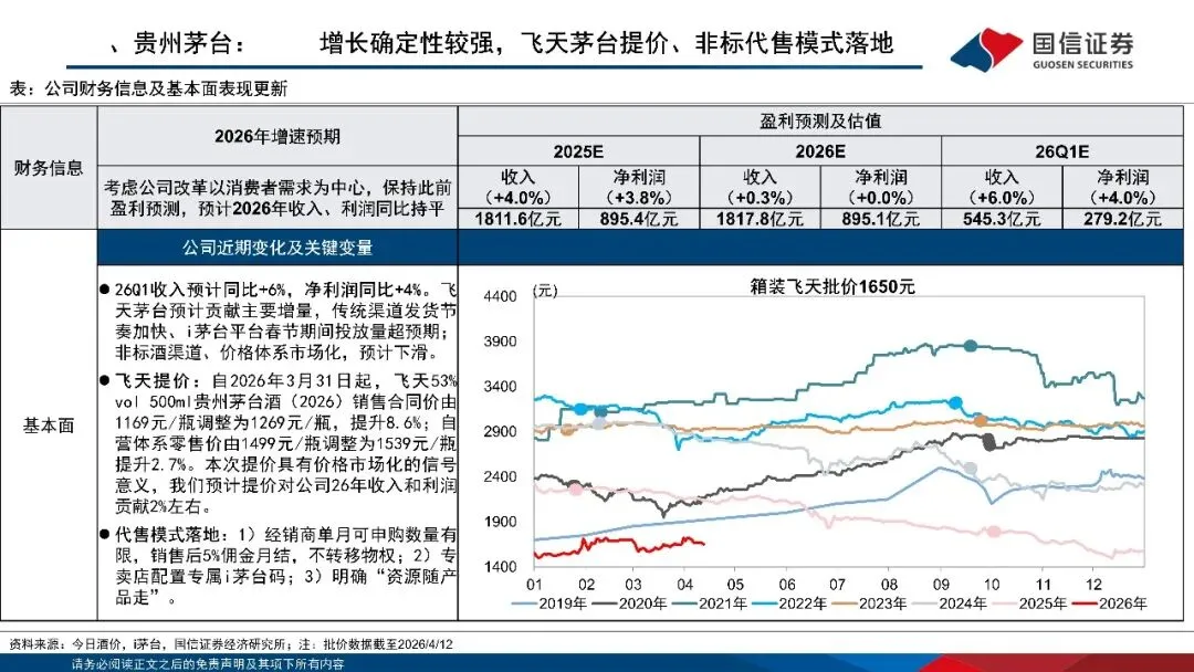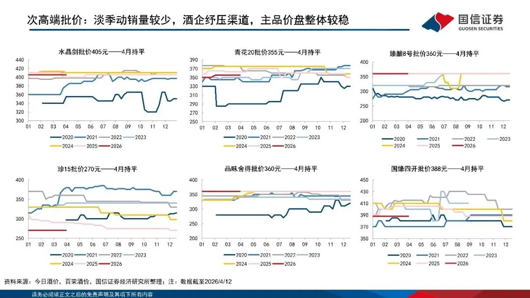 ■需求仍在磨底阶段,茅台价格底部支撑力较强。3月白酒指数放跑赢市场,外部不确定性对行业及酒企影响有限。当前核心矛盾仍在需求端,居民消费信心仍在磨底阶段;我们认为伴随酒企纾压渠道、释放报表压力,同时行业动销进入低基数期,供需矛盾有望改善,建议关注Q1报表出清力度和内需修复节奏。4月行业进入淡季,高端主要大单品批价略有回落,截至4/12飞天茅台批价1650元/同比-244%:2601改革下