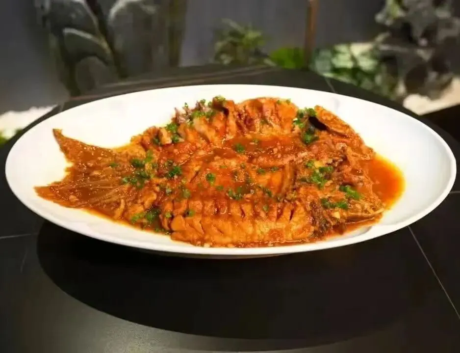 临沂兰山区传统名吃,又名元宝锅塌鱼,剔骨后裹蛋黄淀粉煎至金黄,再文火慢煨收汁,成品酱红入味、形扁无骨,肉质嫩软鲜香,甜鲜交织间尽显河鲜本味与酱汁醇厚。