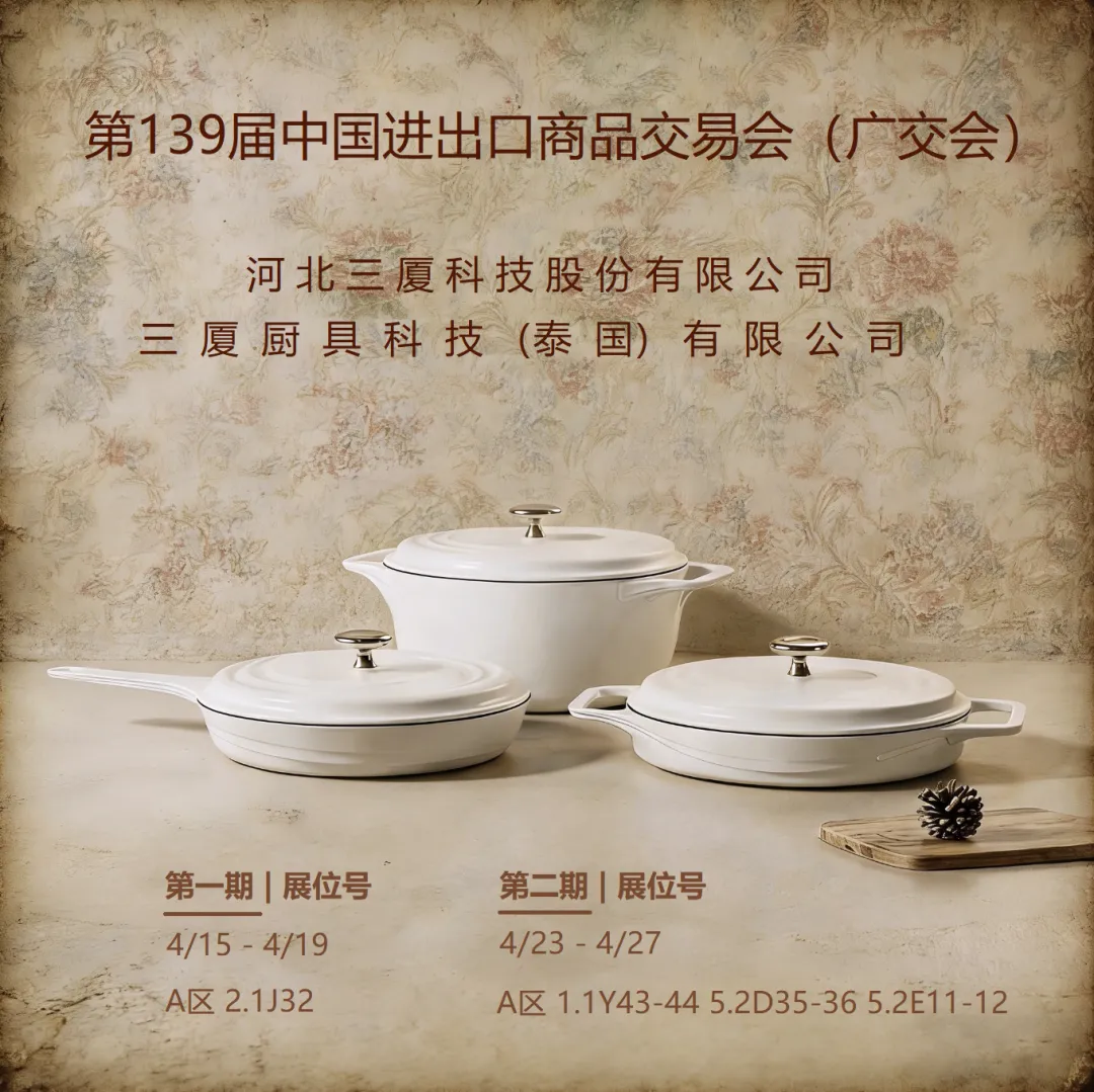 第139届中国进出口商品交易会(广交会)第一期将于2026年4月15日在广州琶洲会展中心拉开帷幕。届时,三厦将携多款高端优质及独具工艺特色产品重磅亮相。期待与您相约广交会,共赴精彩,共赢未来!