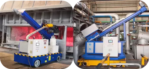 (二)应用行业及优势 1.铝熔铸与铝铸造行业:在铝熔铸和铝铸造企业中,铝水需要从熔炼炉转运到铸造设备或其他加工环节。海德热工的铝水转运包能够实现铝液的安全、稳定转运。其良好的保温性能可使铝液平均温降小于7℃/h ,减少了铝液在转运过程中的温度损失,保证了铝液的流动性和质量,有利于后续的加工成型 。例如,在汽车铝合金零部件的铸造生产中,稳定的铝液温度对于保证铸件的质量和尺寸精度至关重要。使用海德热工的铝水转运包,能够确保铝液在转运到铸造设备时仍保持合适的温度,提高了铸件的合格率和生产效率 。 2.优势总结 保温性能优异:特殊包衬保温工艺有效减少热量散失,维持铝液温度稳定,满足生产对铝液温度的严格要求 。 安全性能高:多种安全装置设计,实现360°旋转无泄漏,杜绝了铝水泄漏带来的安全隐患,保障了生产过程的安全 。 使用寿命长:特殊涂层工艺的不沾铝性能,减少了铝液对包体的侵蚀,延长了转运包的使用寿命,降低了企业的设备更换成本 。三、铝液在线精炼装置(一)产品介绍