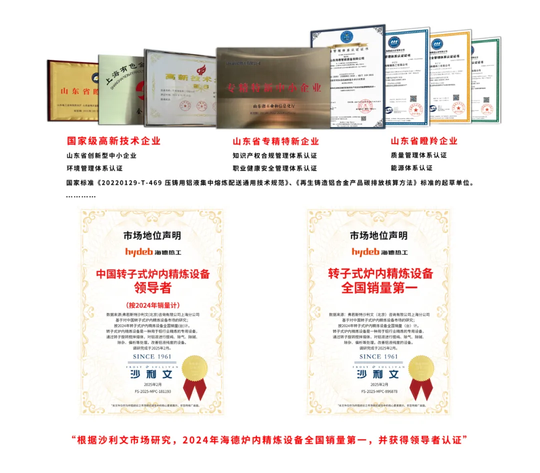 在铝熔铸、铝水转运、精炼等行业领域,济南海德热工有限公司以其先进的技术、卓越的产品和优质的服务,成为了行业内的璀璨明星。自2003年成立以来,海德热工凭借22年的深厚技术沉淀与不断创新,已发展成为拥有130名专业员工、年销售额超亿元、生产车间面积达1.6万平方米(含1200平方米研发中心)的行业领军企业。作为山东省专精特新企业、省瞪羚企业、山东省创新型中小企业、国家级高新技术企业以及中国有色金属加工工业协会会员单位 ,海德热工不仅顺利通过多项管理体系认证,还参与起草了重要国家标准,彰显了其在行业中的权威性与专业性。接下来,让我们深入了解海德热工的典型产品及其在各行业中的应用优势。