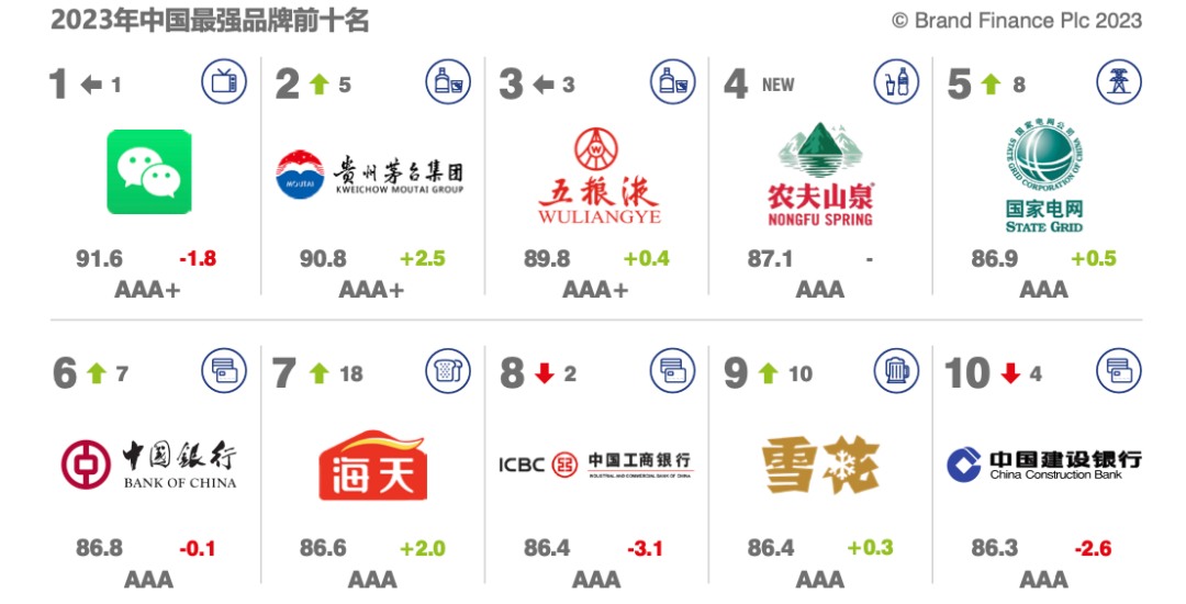 在此次公布的2023年中国最强品牌前十名中,贵州茅台,五粮液、农夫山泉、海天、雪花等品牌上榜。