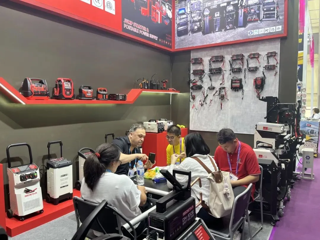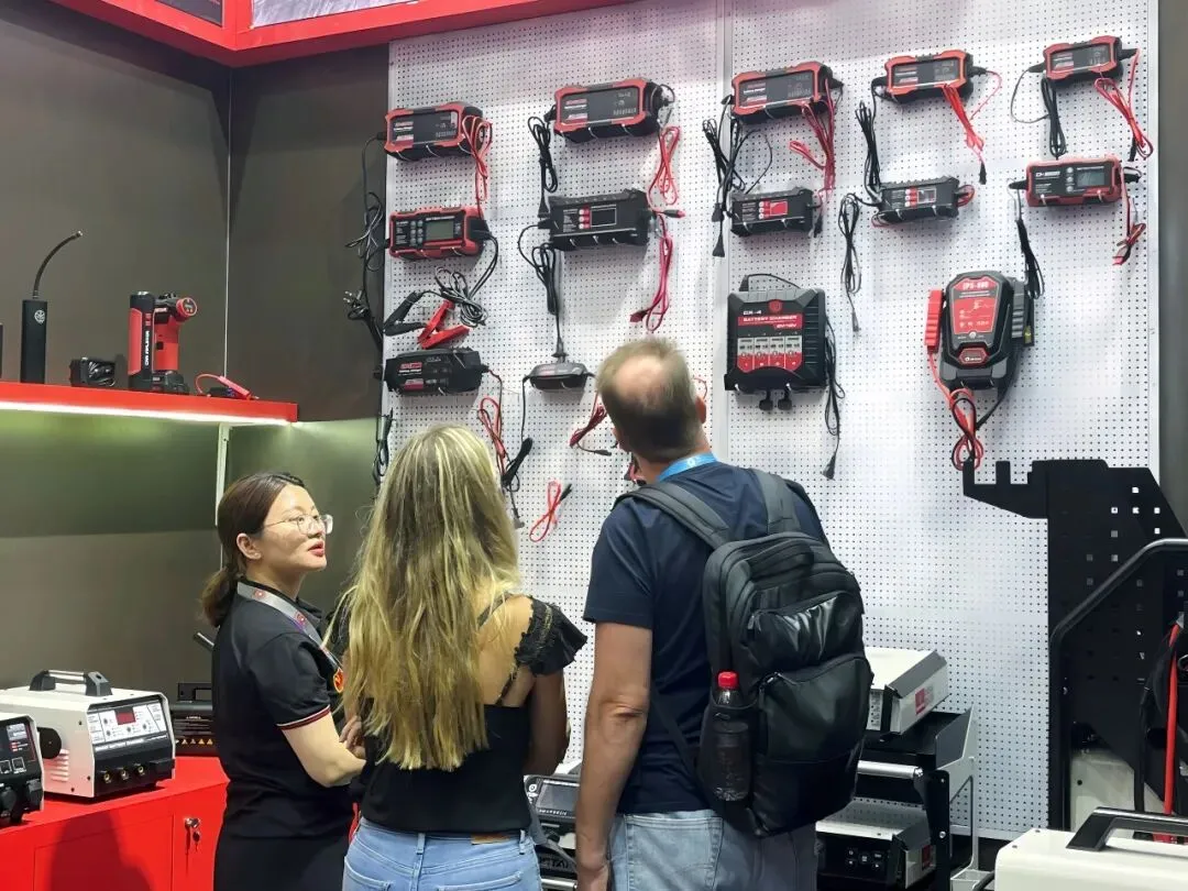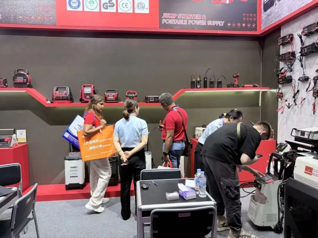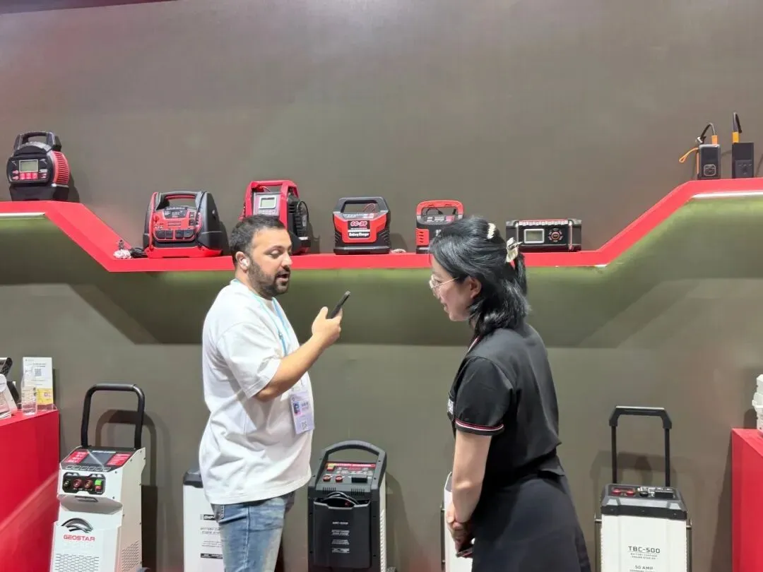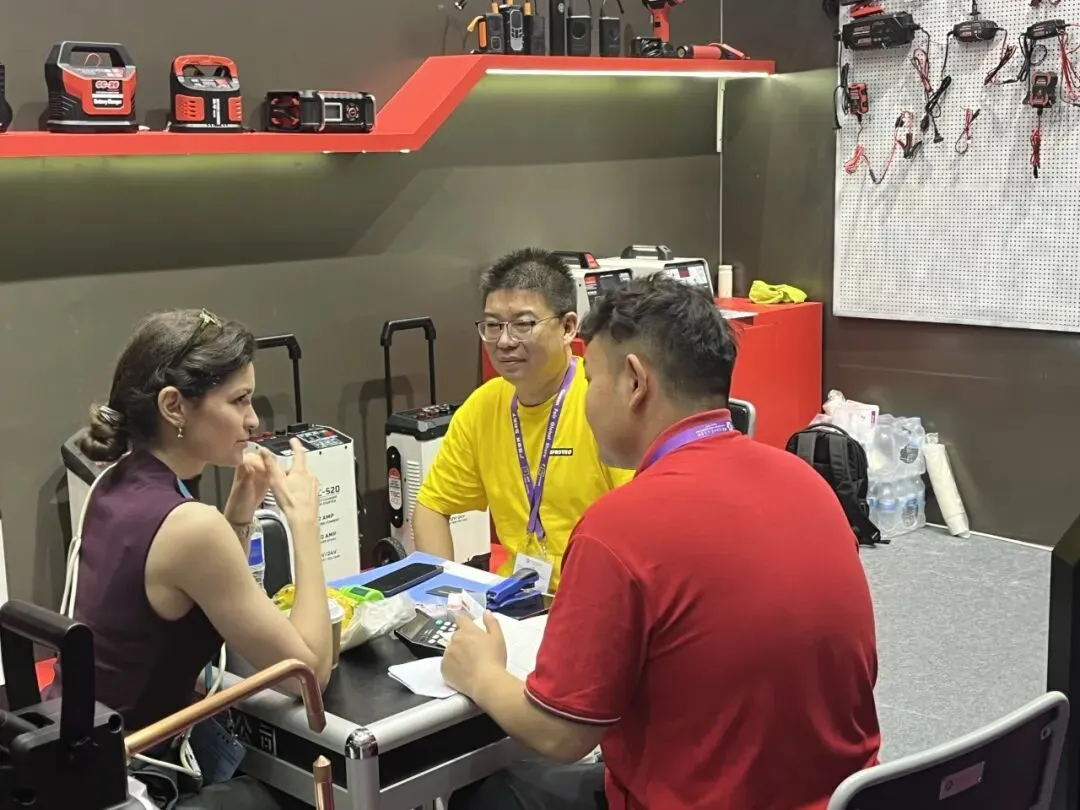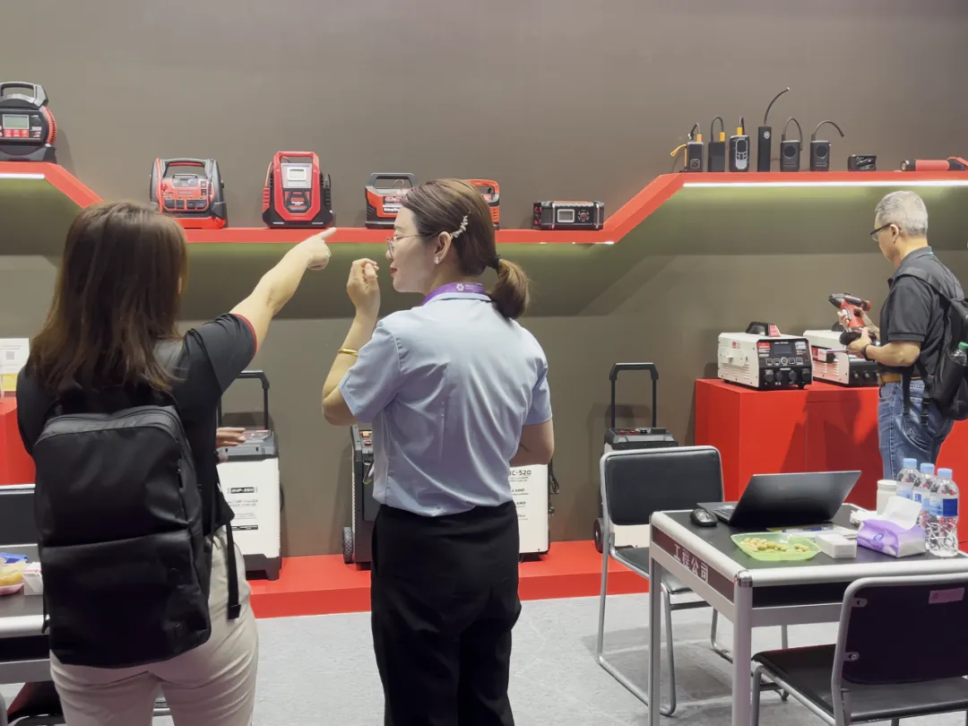 智能充电器、应急启动电源、工业级储能设备全线展出。全系列产品凭借稳定性能、多重安全防护、完善国际认证,以及适配全球车型的通用方案,成为采购商重点关注品类。展会期间,海内外客商接连到访,深入探讨产品参数、供货周期、定制需求与长期代理合作,硬核产品力赢得全球客商广泛认可。