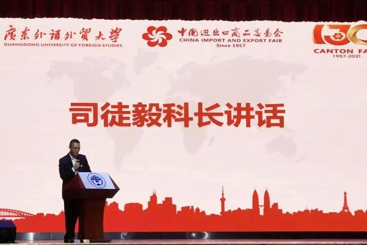 接着,中国对外贸易中心人事处培训发展事务科科长司徒毅上台分享了他在世界各国的经历以及广交会工作心得。其中,司徒毅科长还提到:“我们现在正处于一个新时代,这是一个我国日益走近世界舞台中央,不断为人类做出更大贡献的时代。”同学们需要怀揣中华民族伟大复兴的中国梦矢志奋斗,共同展望未来。