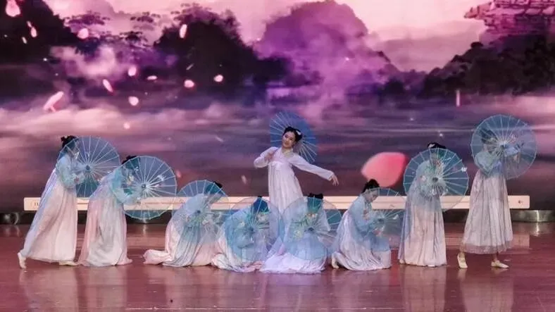 灯光渐暗,同学们带来了舞蹈节目《一汀烟雨》,舞者们用优美的舞姿展现了她们即使在忙碌的实习中仍然不忘对舞蹈的热情,令在场的观众眼前一亮。