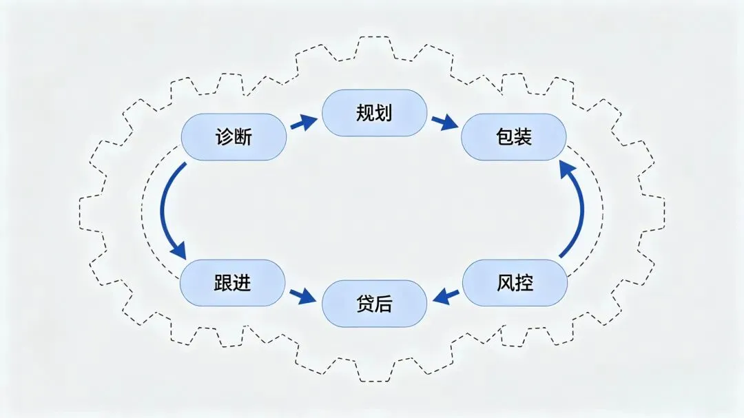 它不是直接给你放钱,也不是普通的助贷中介。它是从企业准备贷款 → 申请 → 放款 → 贷后管理,提供全流程、一对一、定制化的陪伴式服务。