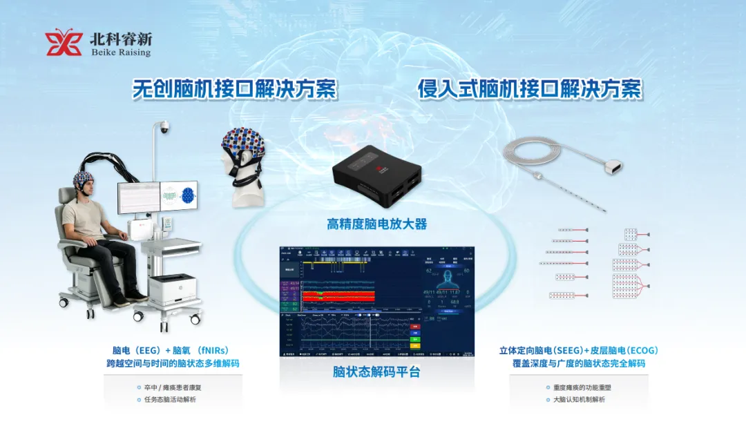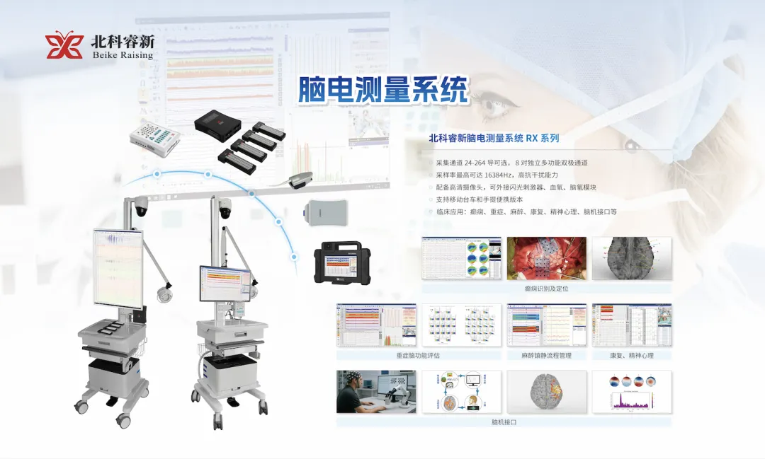 本次展会期间,北科睿新重点展出了脑电测量系统、多模态神经监护与智能分析平台、术中神经监护系统、多模态脑机接口系统以及植入式柔性电极等多款核心产品。相关产品围绕“多模态融合、智能分析、临床转化”三大方向,集中体现了企业在高精度信号采集、多源数据同步、AI算法建模及临床应用落地等方面的技术优势。