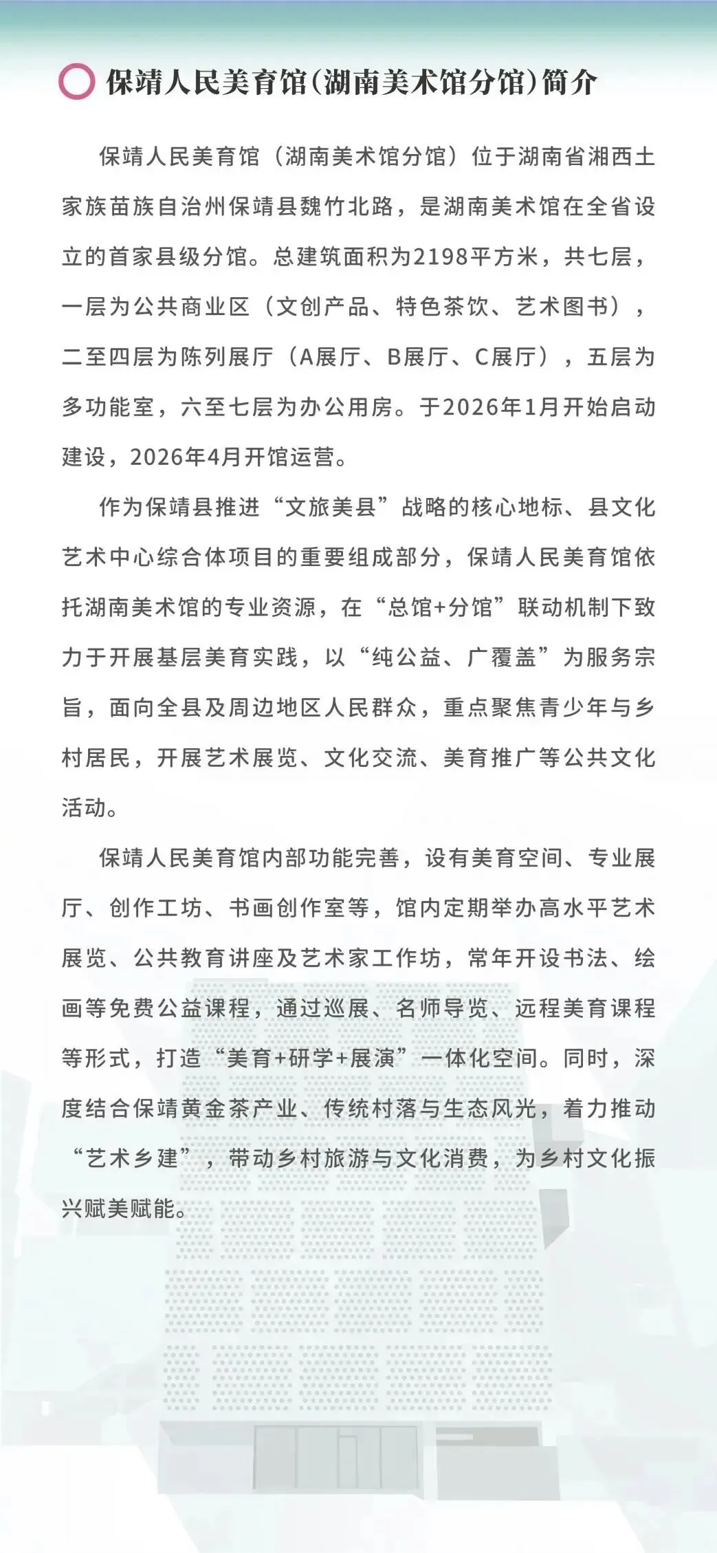 以美为媒,赋能乡村;以艺聚力,共谱新篇。作为开馆首展,本次展览得到了湖南省文联、湖南美术馆、中共保靖县委、保靖县人民政府、保靖县各职能部门、艺术家以及各方面的大力支持,在此,向为保靖人民美育馆建设和运营、以及为本次展览付出辛劳的各位领导、专家、工作人员表示崇高的谢意!我们期待,通过本次活动,进一步搭建艺术交流平台,凝聚文艺工作者力量,用优秀艺术作品讲好保靖故事、湘西故事、湖南故事;我们期待,艺术与乡村深度融合,人民美育在酉水河畔落地生根、开花结果,引领乡村从 “风景美” 迈向 “风尚美”,焕发乡村文明新气象,酉水明珠、黄金茶城、幸福保靖因艺术而更加出彩!