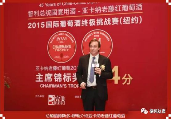 在第13届智利年度葡萄酒颁奖典礼上,完美公司亚卡纳老藤红葡萄酒荣获金奖!又一个葡萄酒重量级大奖!1月18日,智利葡萄酒联盟亚太区总裁Julio Alonso Ducci向完美公司颁发了获奖证书。