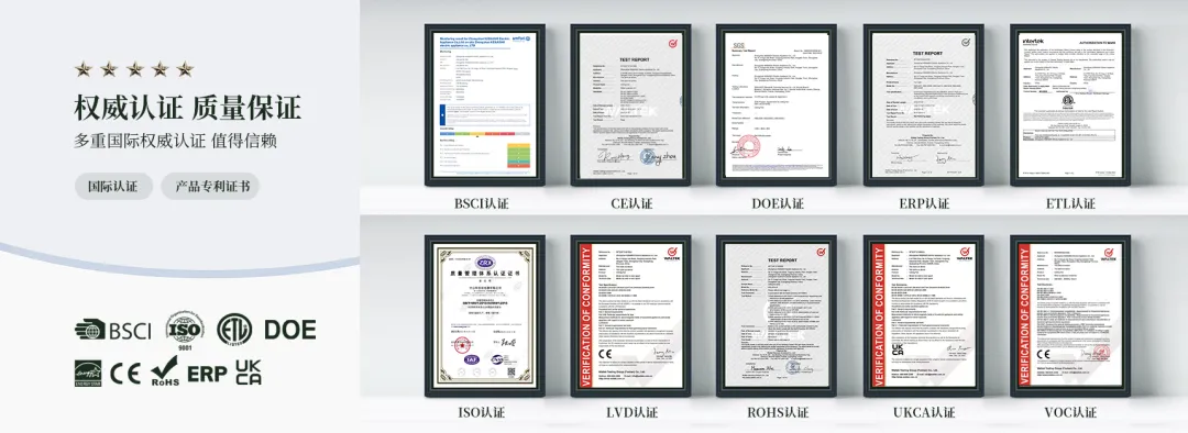 坚守对品质与合规的至高承诺,工厂已全面通过UL、ETL、CE、ROHS、CB、SAA、CCC等全球产品认证,并严格遵循BSCI社会责任标准及ISO9001质量管理体系。产品已成功进驻欧美主流商超平台,深受全球灯具批发商、电器品牌商、地产及酒店客户的信赖。
