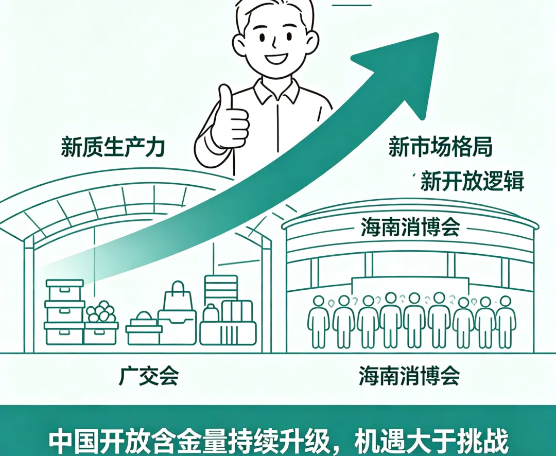 广州广交会,海南消博会,一南一南,同一天开锣。一个“卖全球”,一个“买全球”,像极了中国开放的两扇大门,齐齐推开。