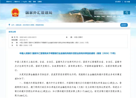 政策速递丨央行外汇局新政升级!境外贷款杠杆率上调至1.5,跨境融资利好释放