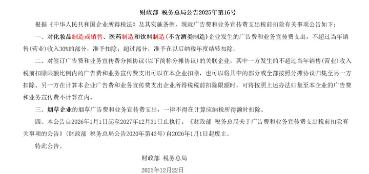 2025年12月22日,财政部、税务总局联合发布《关于广告费和业务宣传费支出税前扣除有关事项的公告》(财政部 税务总局公告2025年第16号),自2026年1月1日起执行,政策执行期限至2027年12月31日。