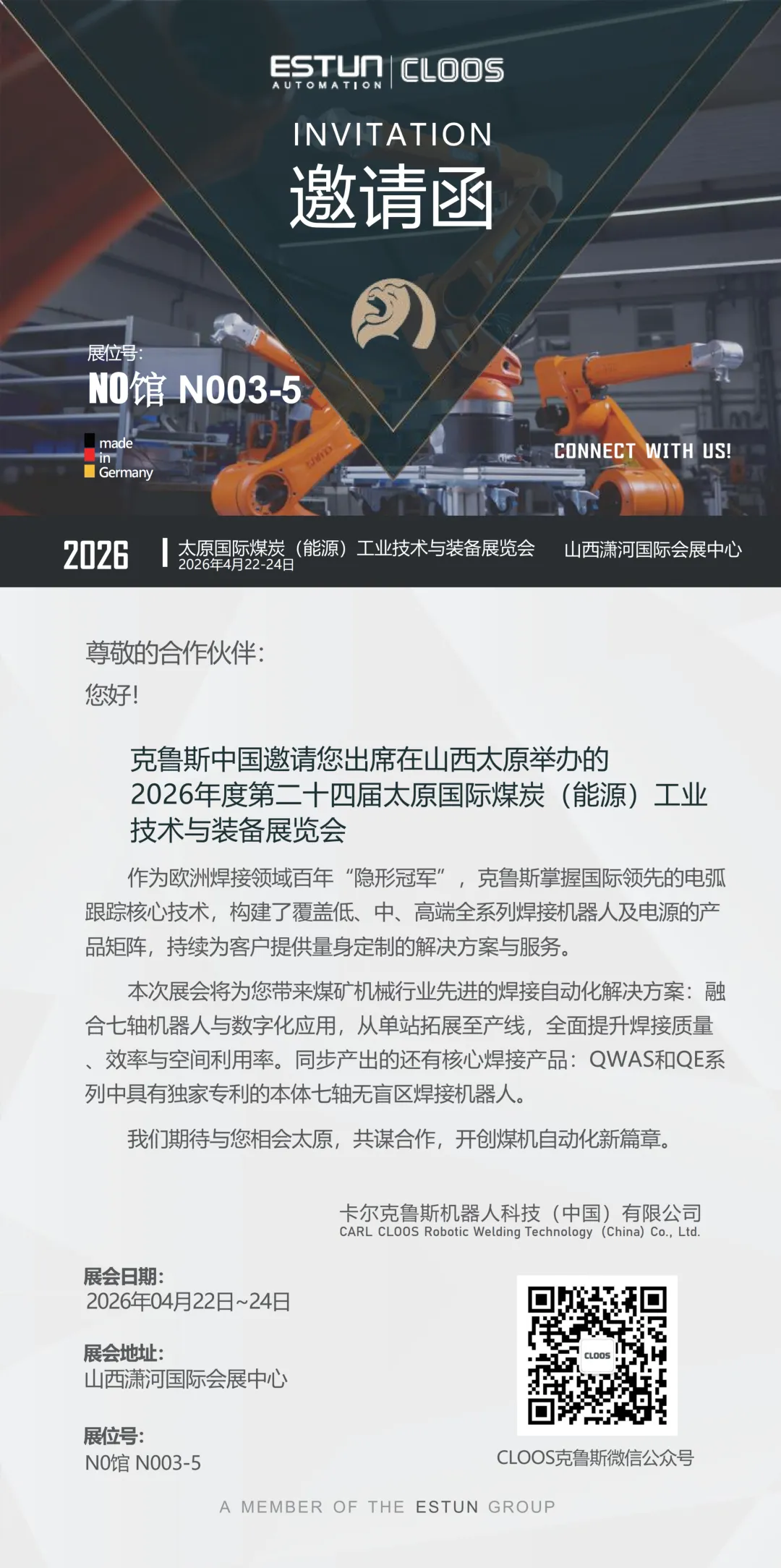 展会邀请|CLOOS克鲁斯诚邀您莅临第二十四届太原国际煤炭(能源)工业技术与装备!