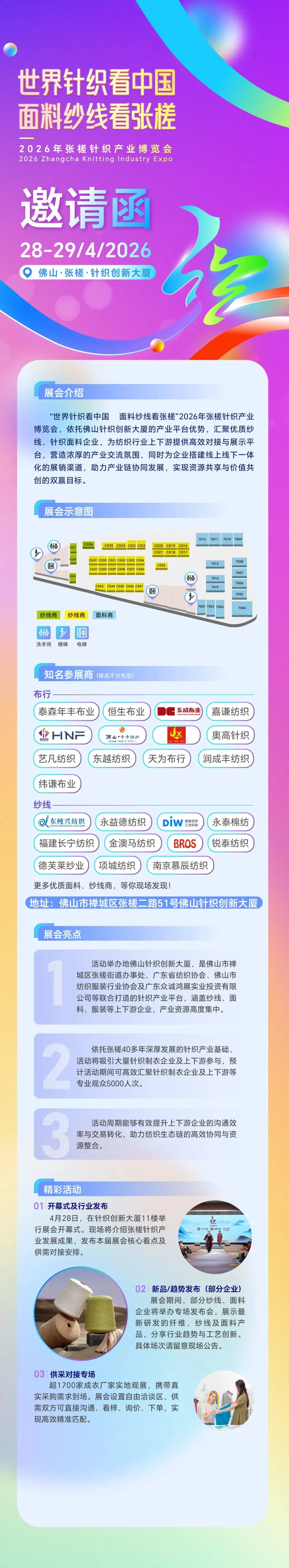 由佛山市禅城区张槎街道办事处、广东省纺织协会、佛山市纺织服装行业协会共同主办,佛山针织创新大厦承办,佛山市禅城区张槎针织服装行业协会、佛山市禅城区张槎街道玉带社区居委会共同协办的“世界针织看中国·面料纱线看张槎——2026年张槎纱线面料博览会(展会)”将于今年4月举办。