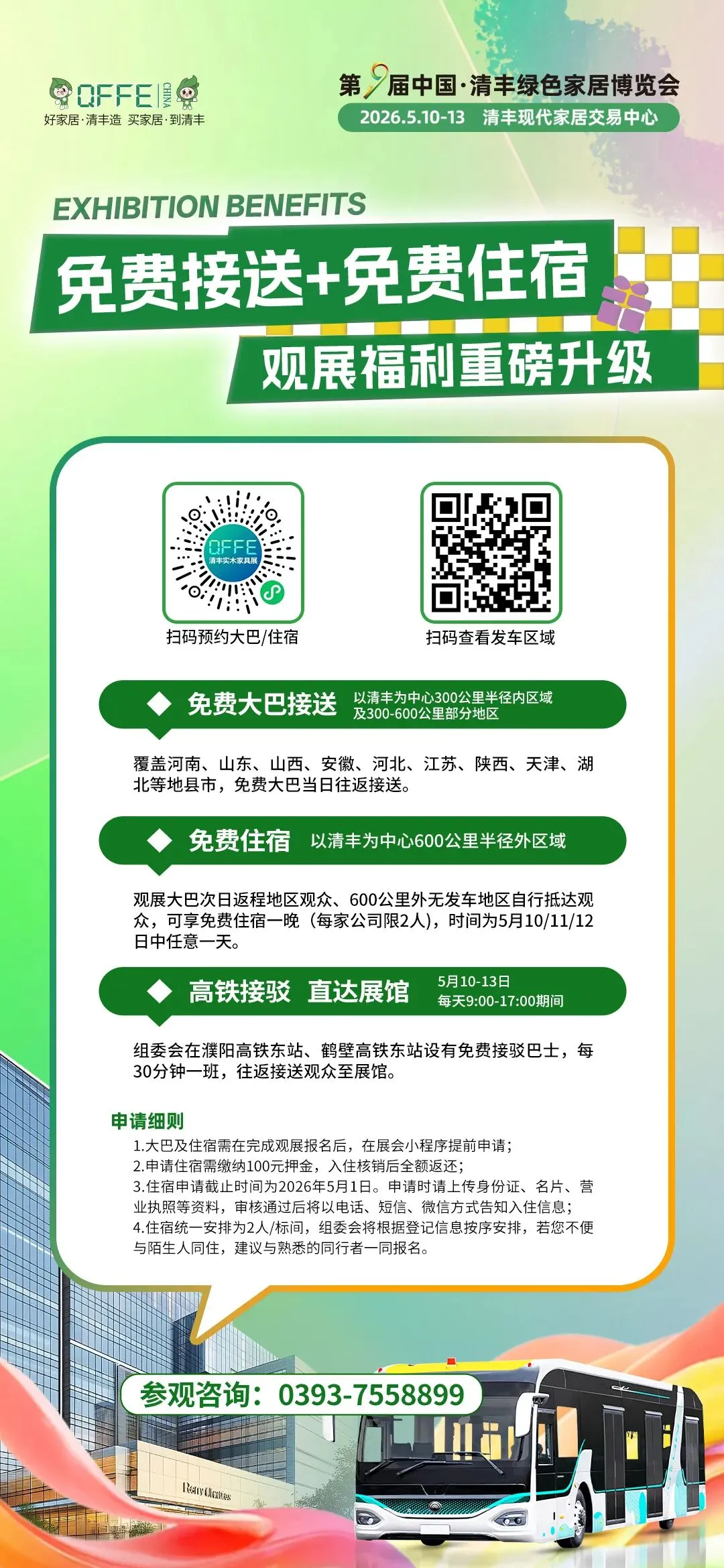 展会期间,组委会针对以清丰为中心600公里外提供免费住宿一晚。若有住宿需要,可点击“预订免费住宿”。