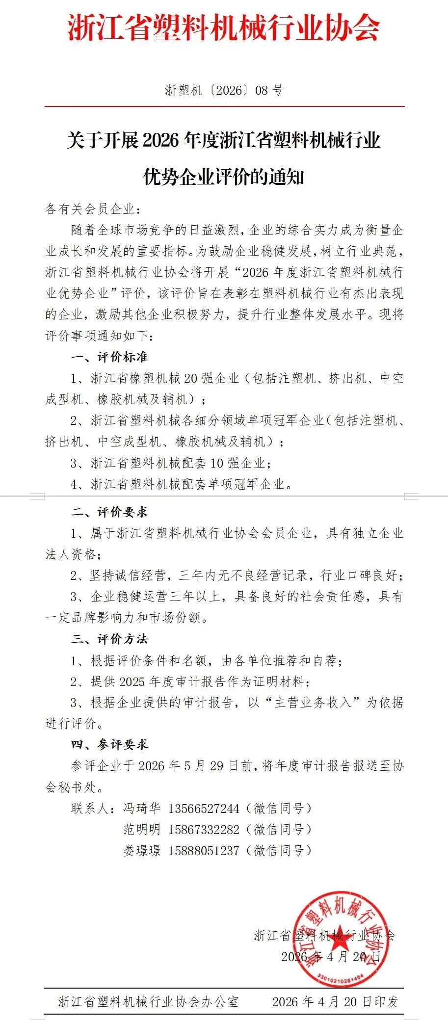 通知丨关于开展2026年度浙江省塑料机械行业优势企业评价的通知
