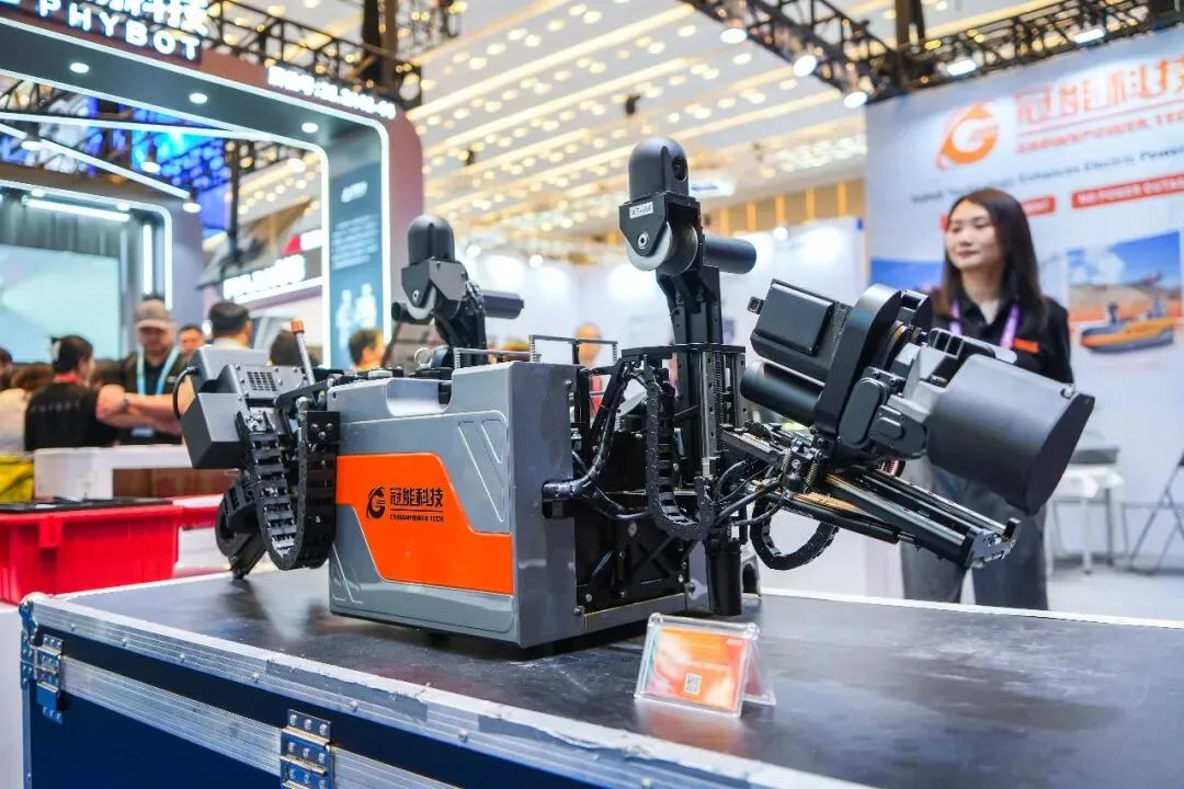 广东冠能电力科技发展有限公司展出的X7-AI带电接火机器人,实现操作全过程由机器人自感知、自决策、自执行、自适应,通过自主化AI视觉及运动规划算法,可自动完成剥线、接火、紧固等关键环节,直击传统作业中地形复杂、难以到达、施工成本高昂等痛点。