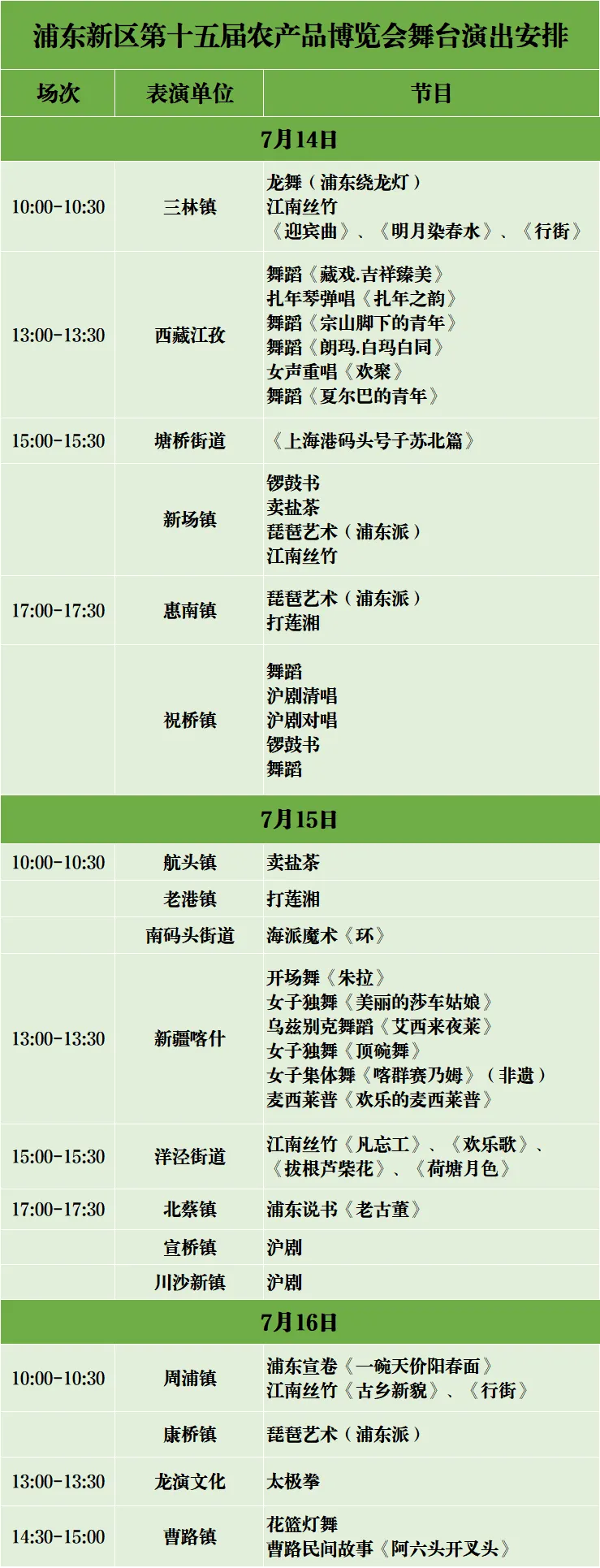 主活动区内布置舞台区,每天定时进行浦东非遗群众文化展演。节目单如下:
