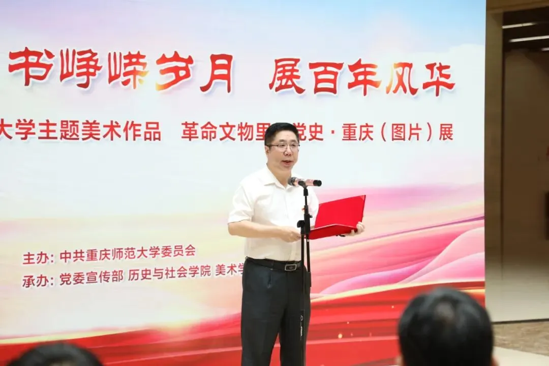 6月17日上午,展览开幕式在我校博雅楼隆重召开。 重庆市党史学习教育办公室信息筒报组副组长、市委组织部党员教育中心副主任刘浩,重庆市教育委员会宣传教育处干部张忠伟,重庆市美术家协会副主席、西南大学教授刘曙光,四川美术学院造型艺术学院党总支书记、副院长王天祥,重庆大学艺术学院副院长张楠木,我校党委书记曾礼,党委副书记、校长孟东方,党委副书记陈志军,相关职能部门主要负责人、历史与社会学院和美术学院主要负责人、离退休老同志代表、师生代表共计100多人参加开幕式。开幕式由党委常委、副校长陆远权主持。