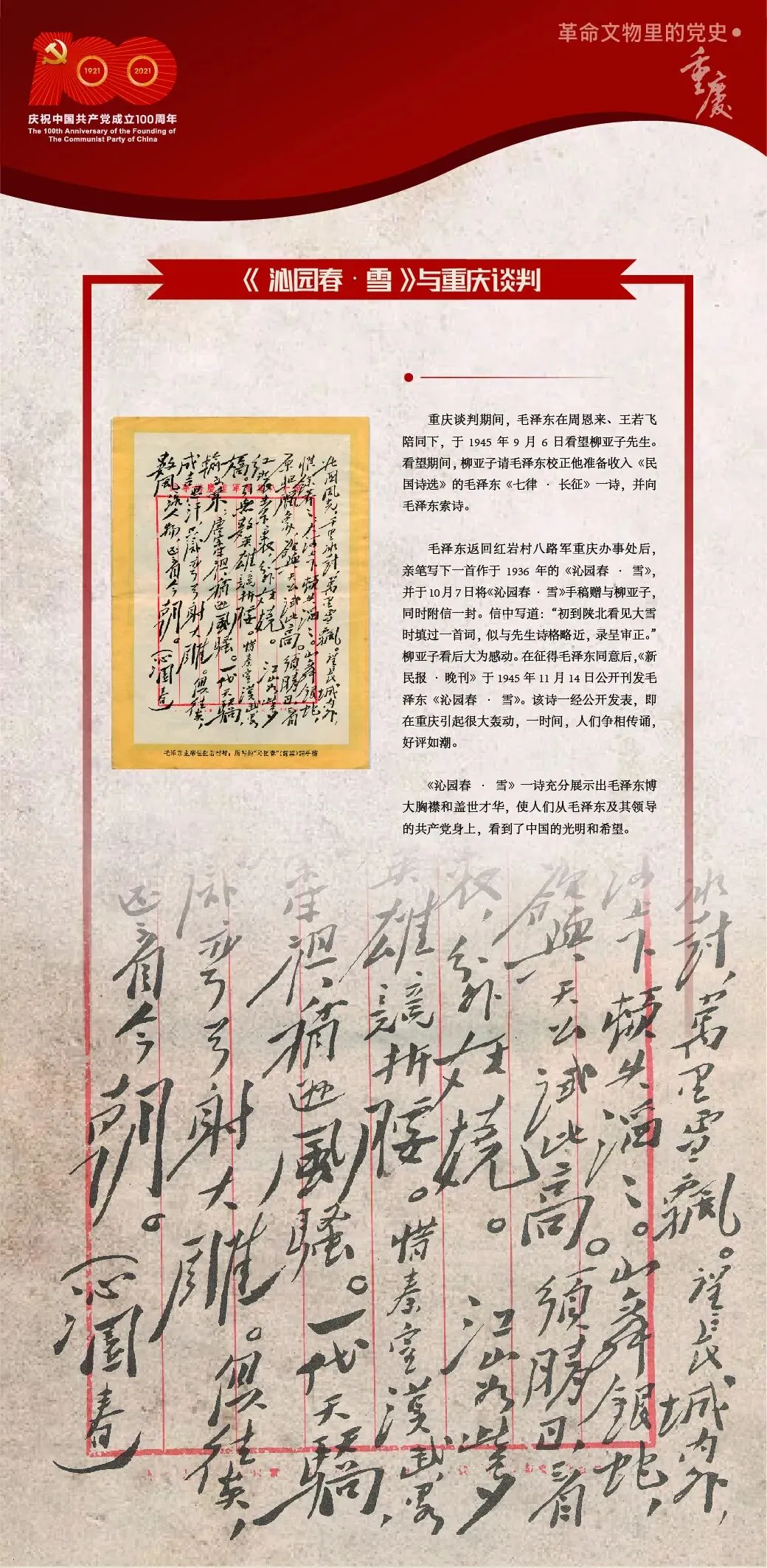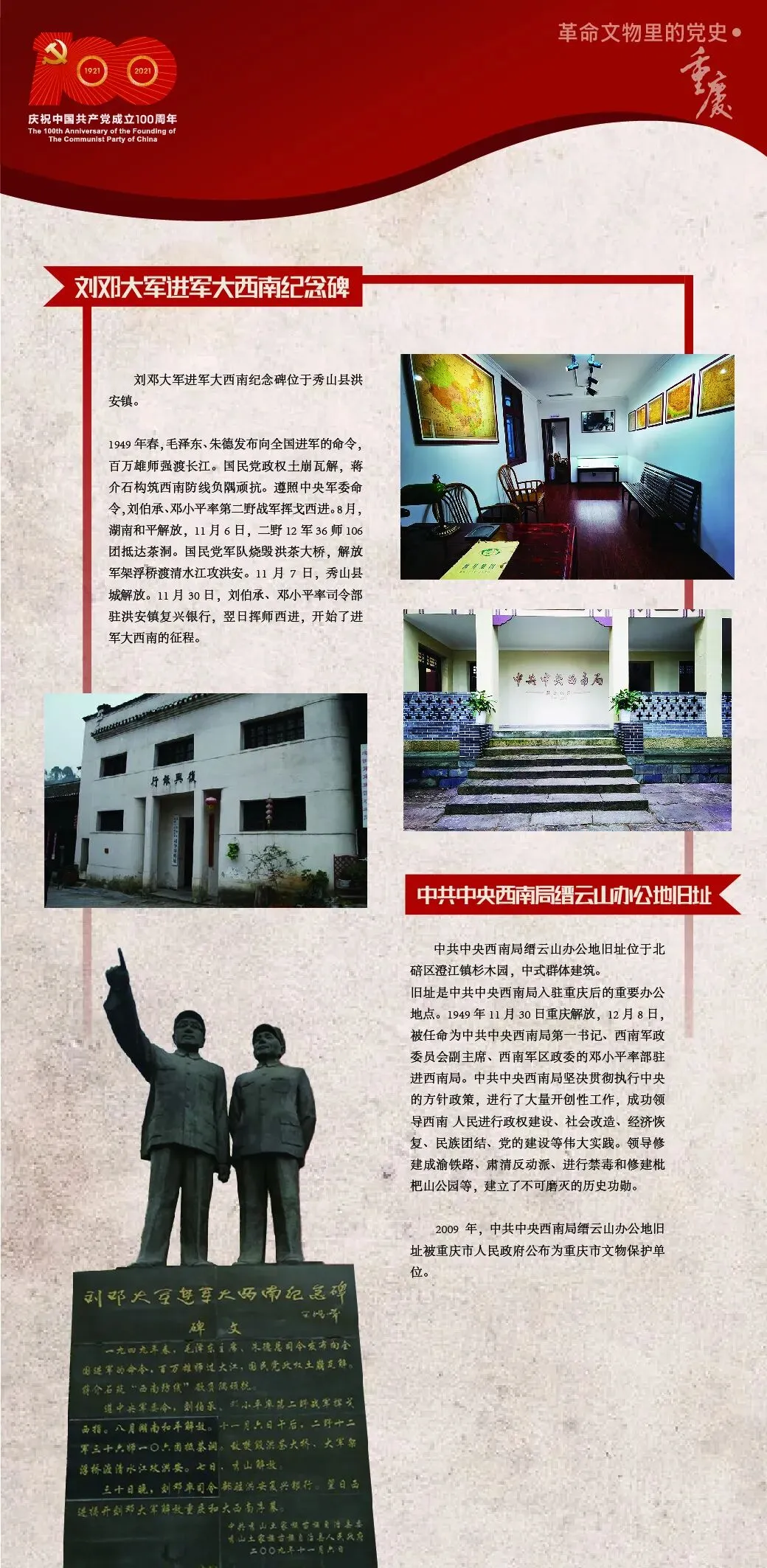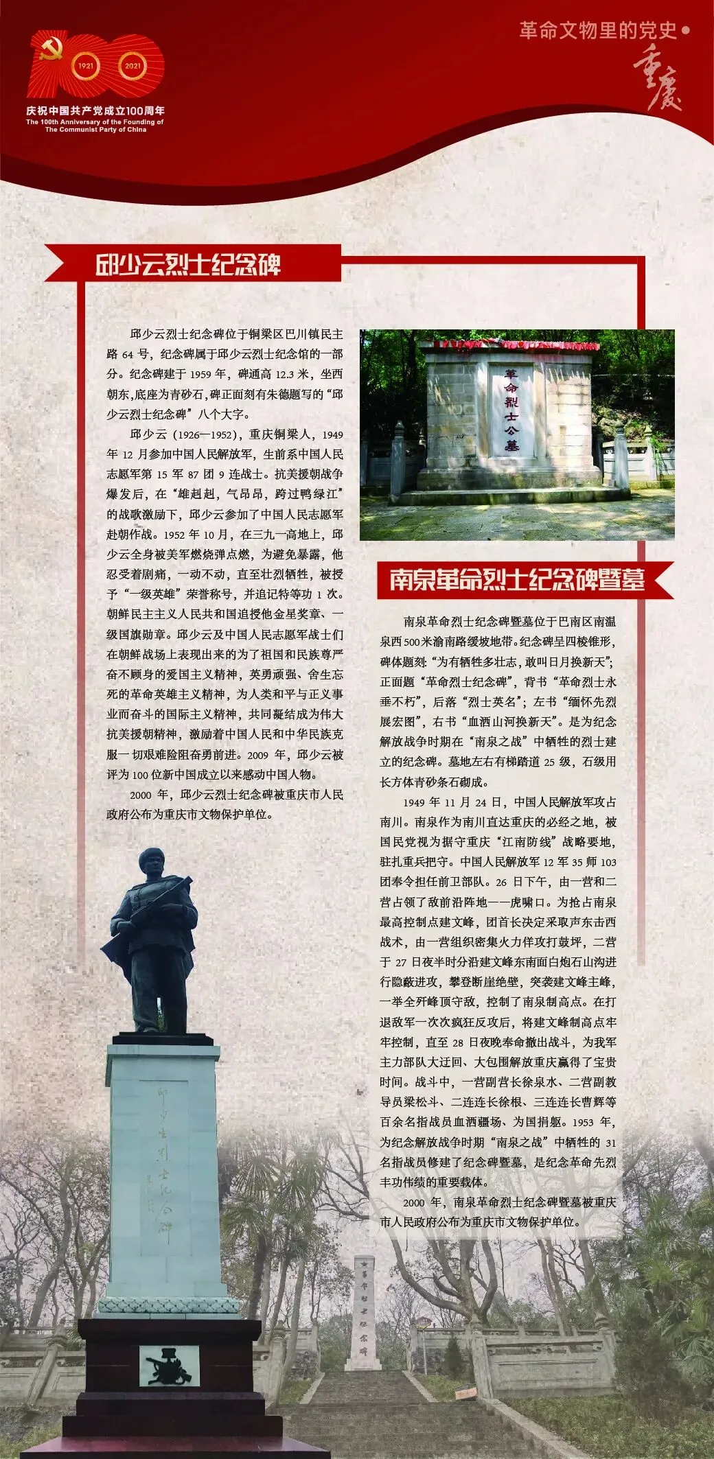 抗战胜利纪功碑暨人民解放纪念碑、中国共产党重庆地方执行委员会旧址、重庆“三·三一“惨案烈士墓、石壕红军烈士墓、聂荣臻元帅故居、中共代表团驻地旧址……一处处革命遗址遗址以图片的形式呈现,一砖一瓦都承载着波澜壮阔的时光。