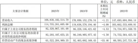 茅台2025年业绩呈现“全年微降、单季暴跌”,打破了上市以来持续正增长的记录,其全年实现营收1688.38亿元,同比下降1.21%;实现归母净利润823.20亿元,同比下降4.53%。第四季度则成为拖累全年业绩下滑的关键,单季实现营收403.84亿元,同比下降19.43%,实现归母净利润176.93亿元,同比大降30.34%。同期经营活动产生的现金流量净额也同比下降33.46%,主要与渠道回款放缓、存货占用资金增加有关,侧面反映出市场需求疲软与渠道销售压力。