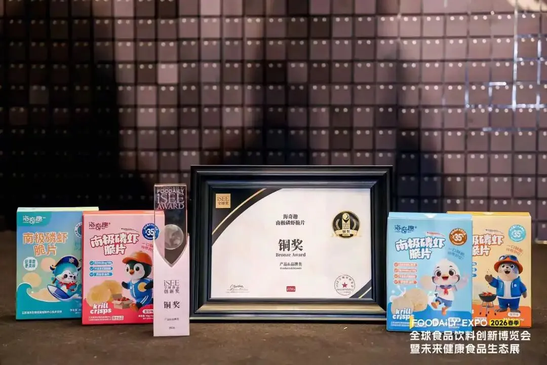 展会期间,备受全球食品行业瞩目的iSEE全球奖年度盛典暨颁奖典礼圆满举办。本届iSEE全球奖吸引力十足,共计收到来自中国、日韩、欧洲、北美、澳新等全球多个国家和地区的5688个案例积极提报,竞争异常激烈。历经7个月的严苛遴选,经过3轮系统化评审,从产品创新力、消费洞察力、商业表现力等六大维度层层考核,4月15日,年度终极大奖正式诞生。海奇趣南极磷虾脆片凭借独特的产品创新、卓越的产品品质以及对海洋资源高值化利用的探索,在5688个参赛案例中脱颖而出,成功斩获iSEE全球食品创新奖铜奖,获奖比例仅为0.97%。