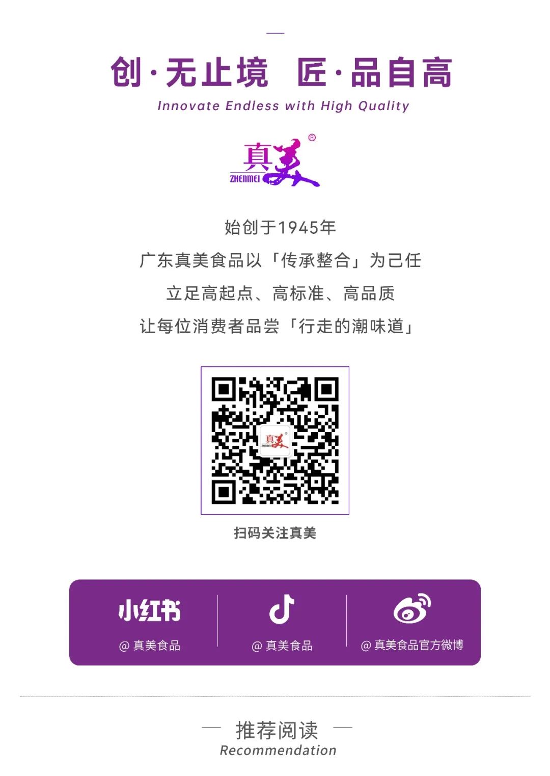 深耕休闲食品多年,真美食品专注为市场及消费者打造“健康·美味·营养”的系列产品,将动植物功能性提取物、海藻提取物、功能肽等与休闲食品进行有机结合。品牌拥有自主成熟的产品研发实力和稳定高标准的品控系统,先后将古法炭烧潮式肉脯、果蔬肉脯、生酮食品等多款爆品推向市场,并通过精细化服务升级,帮助合作伙伴实现新突破,以打造“双赢”发展格局为目标,矢志赋能国内休闲食品高质量发展。