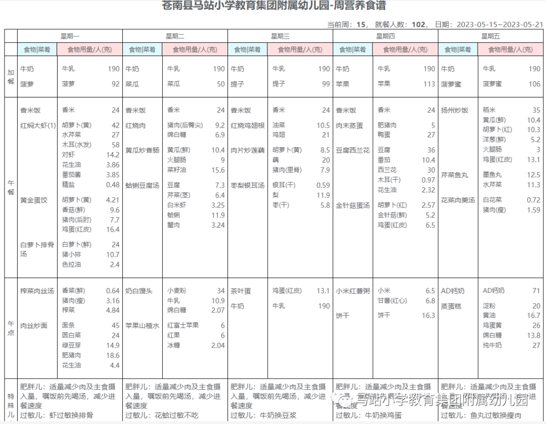 幼儿园的食谱是严格按照幼儿营养平衡膳食的标准制定的,经过科学的营养计算,食物种类多,量合理纠正偏食,使幼儿营养摄入均衡。所以,我们建议家长留心食谱(每周食谱公布在园公众号上),以便在家安排的食谱尽量和幼儿园的不同,从而让幼儿摄入更多种类的食物。