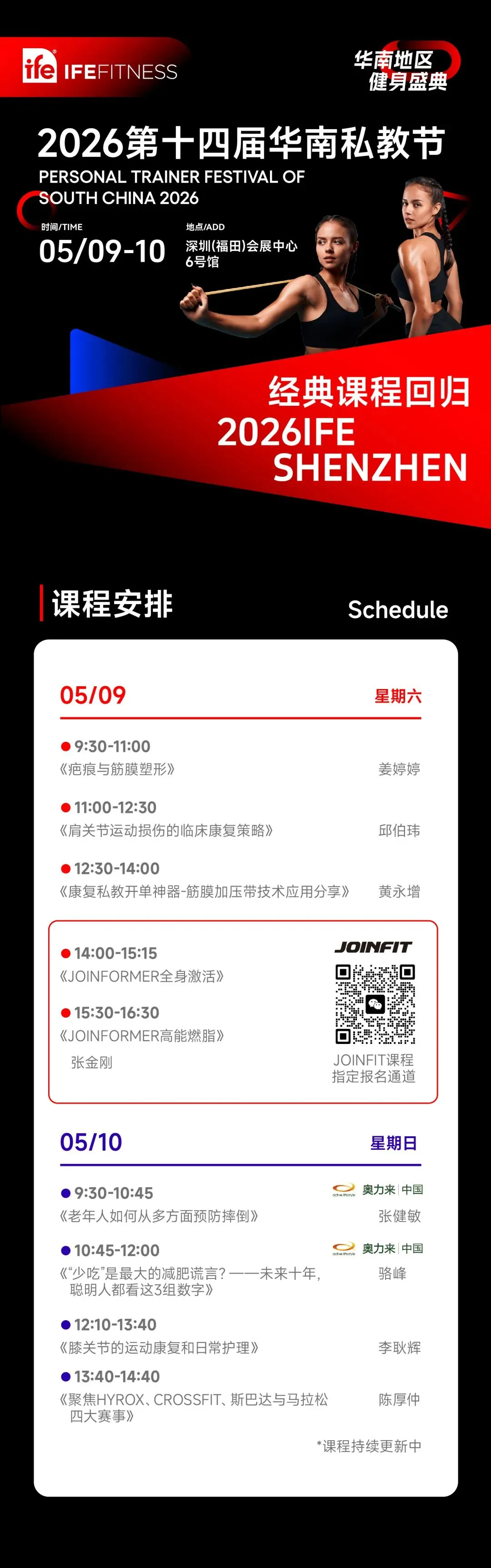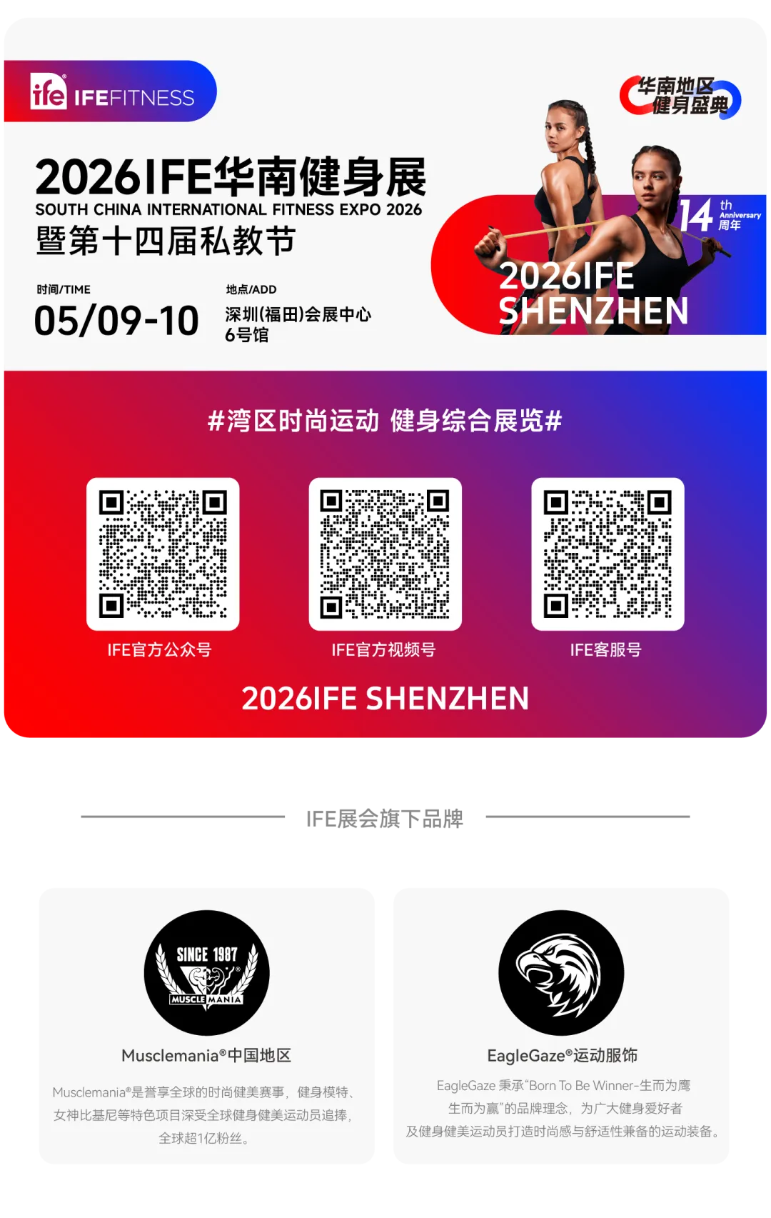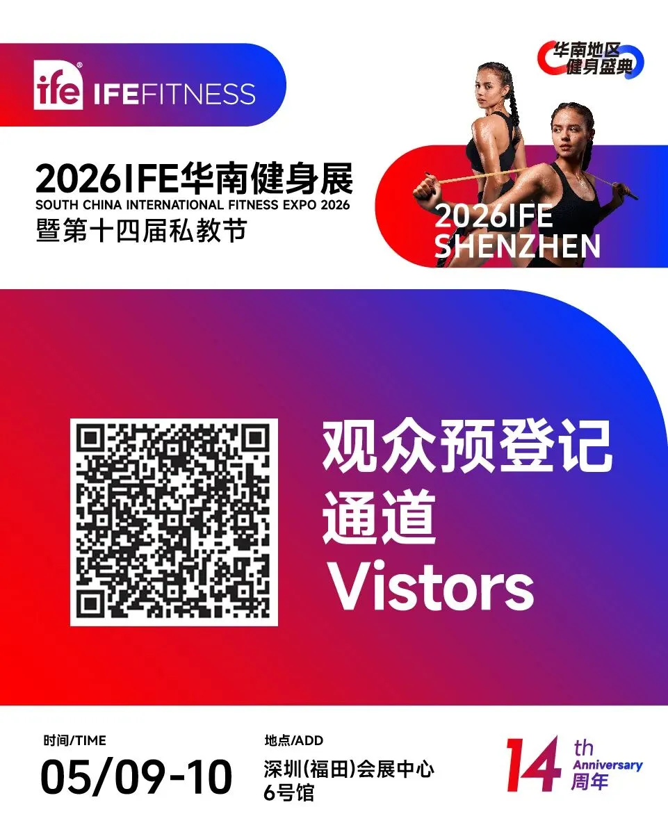 2026年5月9-10日,第十四届IFE华南健身展将于深圳(福田)会展中心隆重举行。10,000㎡健身贸易展示总面积、200+海内外知名品牌、20,000+人次专业观众、特邀100+专业嘉宾、同期活动60+项。即刻参与预登记,限时免费领取50元观展门票。